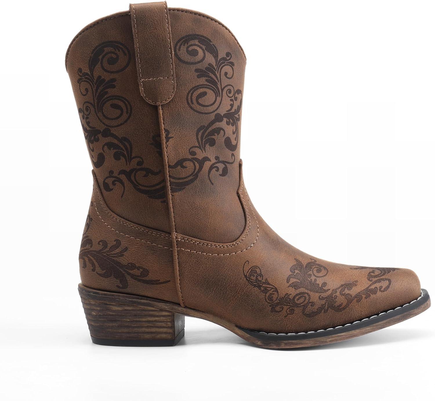 DREAM PAIRS Cowboy Cowgirl Boots for Women, Round Toe Embroidered Mid Calf Western Boots for Work, Country Concerts, Rodeos, Casual Outings(All Brown)