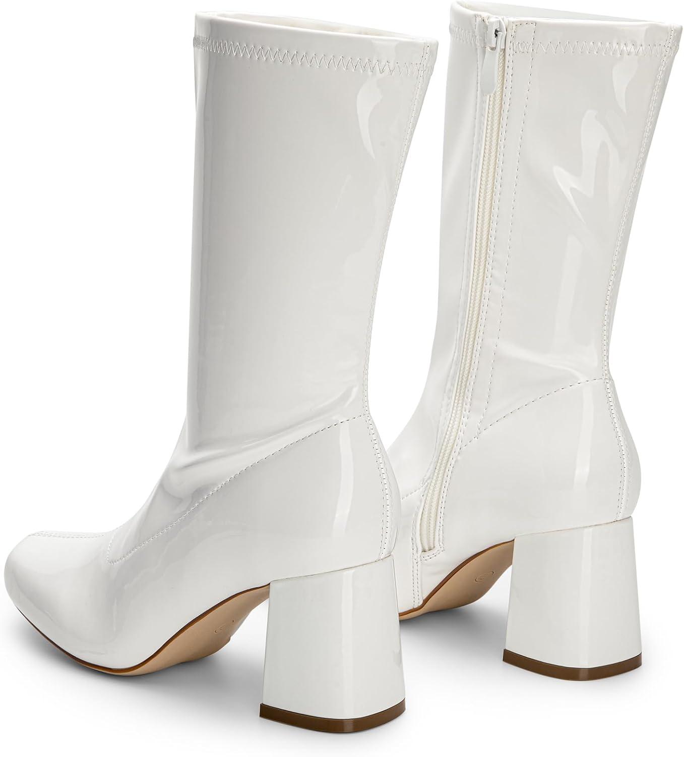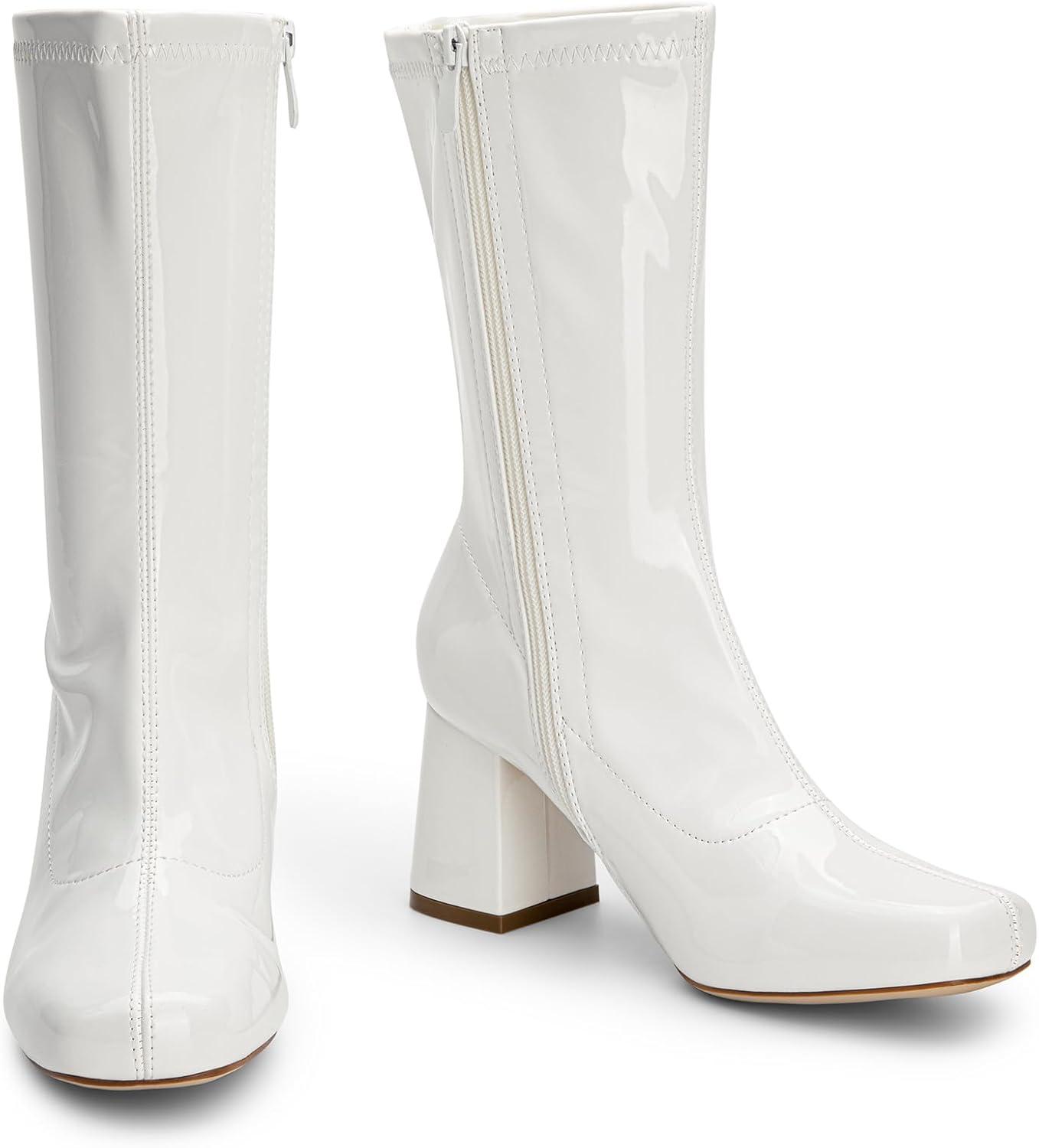 DREAM PAIRS Women’s Mid Calf Gogo Boots Low Block Heel Square Toe Ankle Boot with Zipper for Party Cosplay Dance(White-pat-1)
