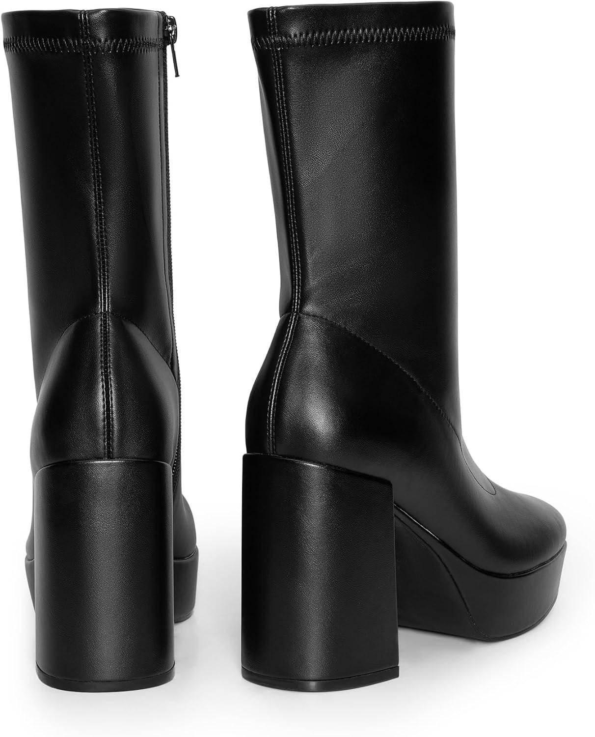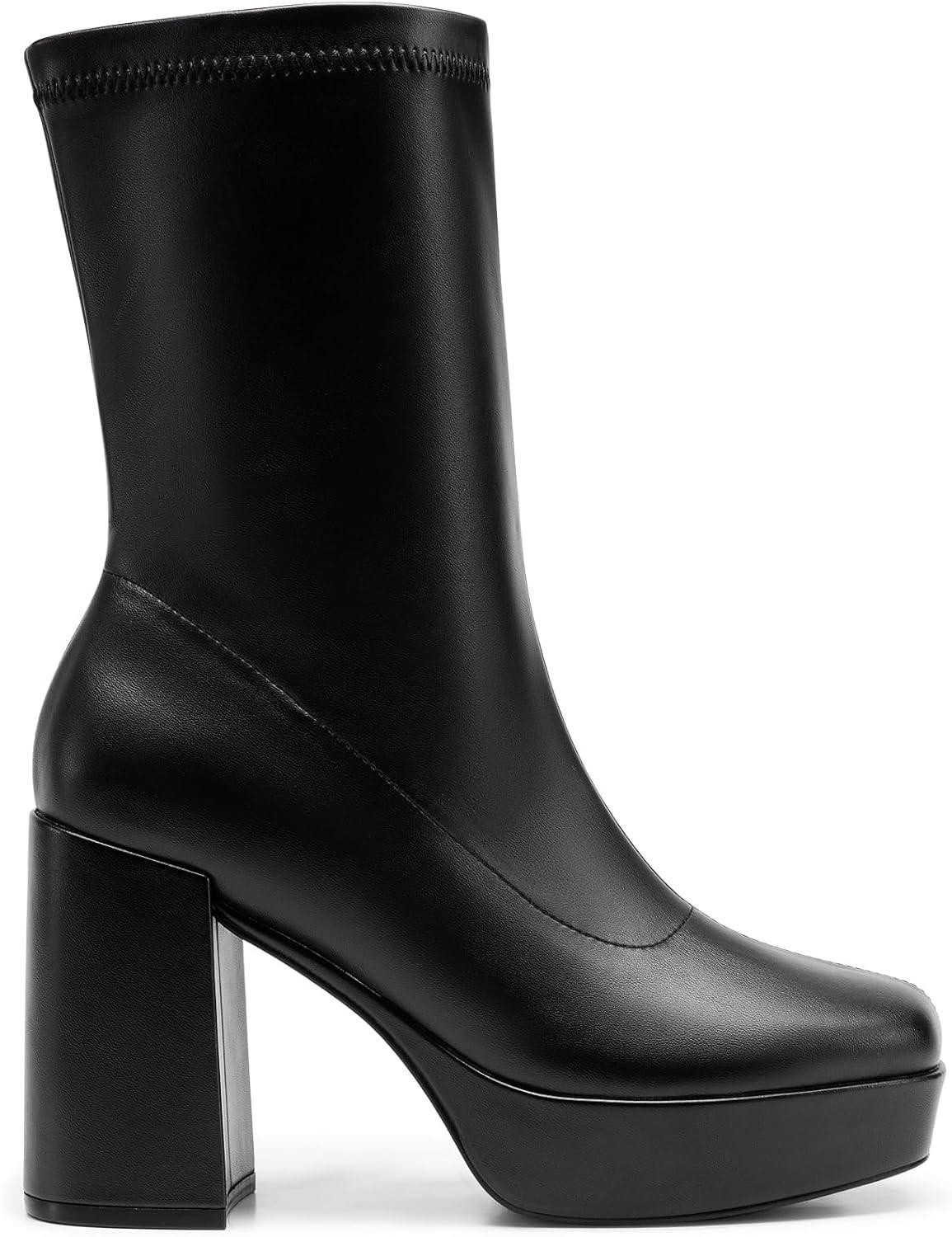 DREAM PAIRS Women’s Mid Calf Gogo Boots Platform High Chunky Block Heel Square Toe Ankle Boots(Black-pu)