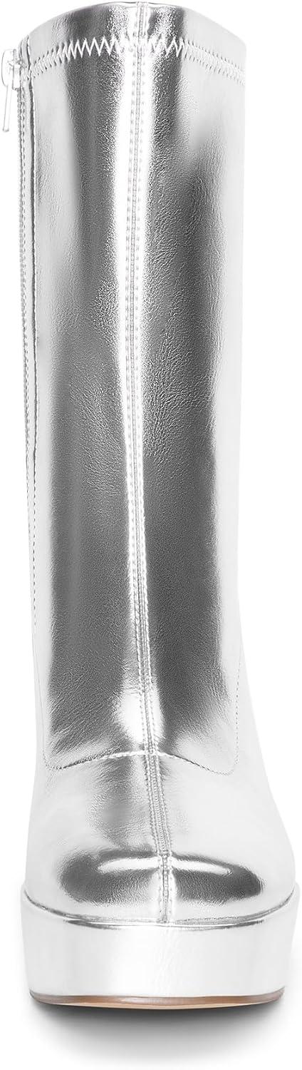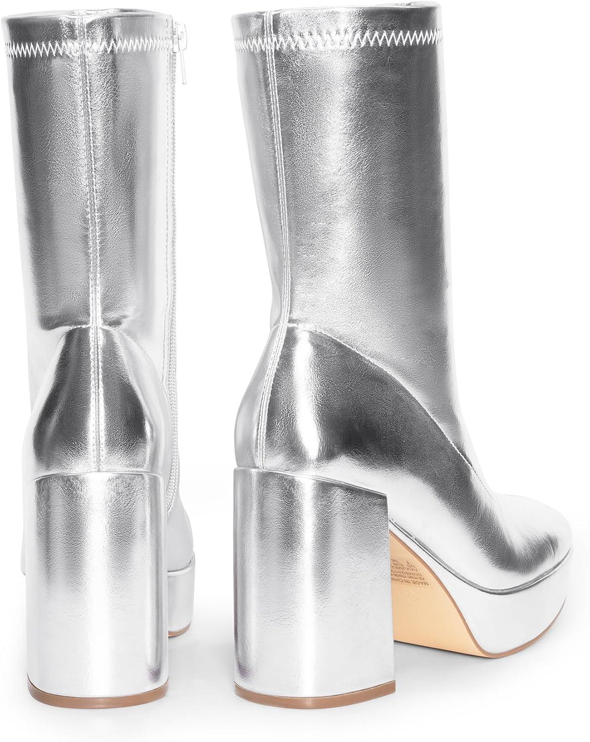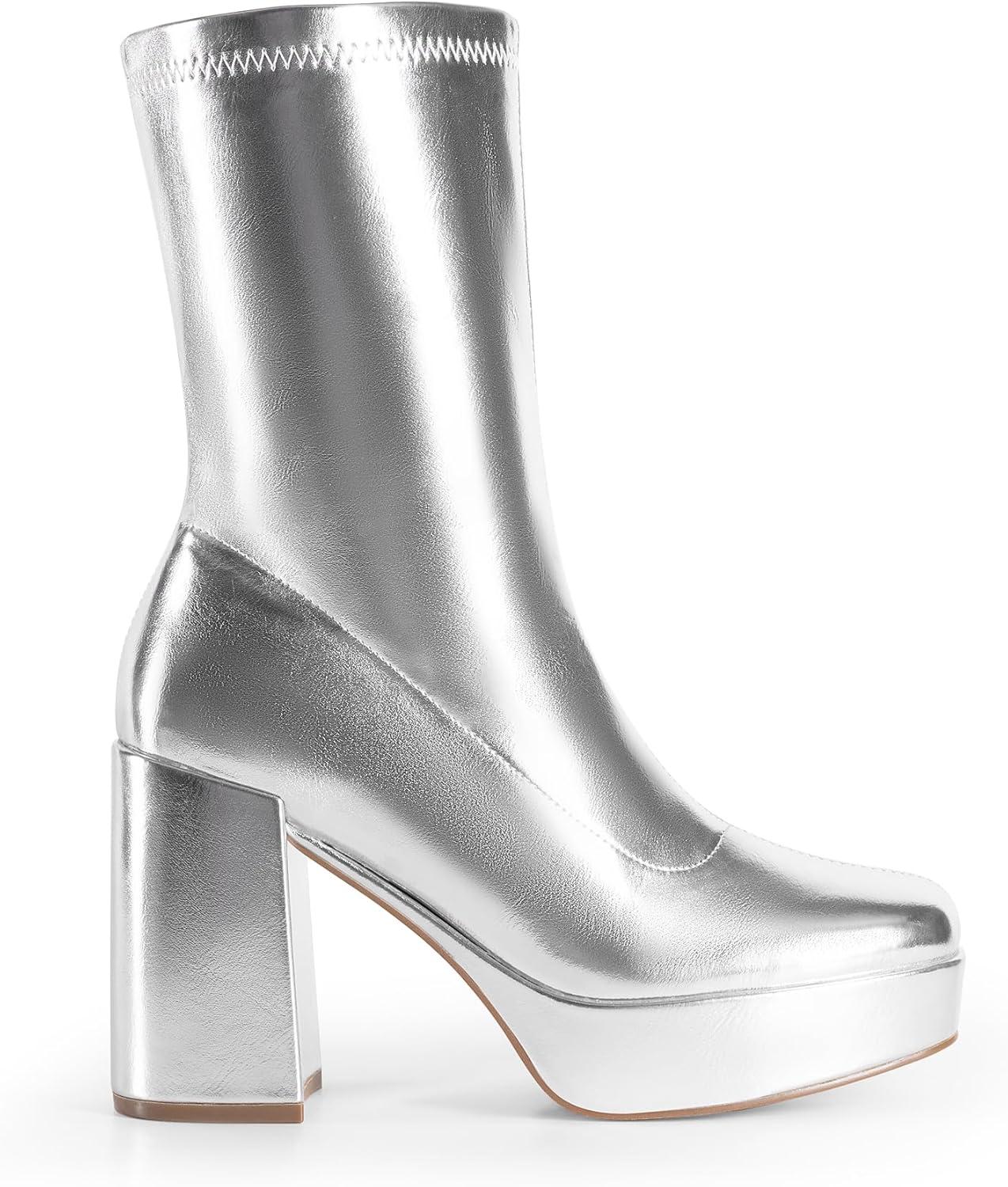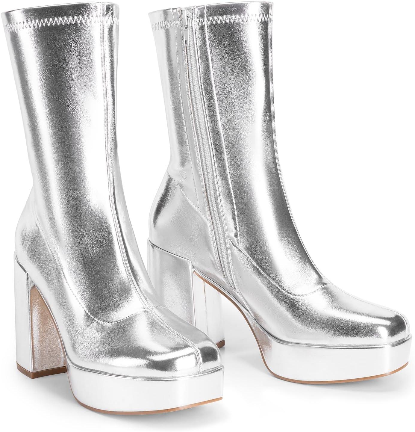 DREAM PAIRS Women’s Mid Calf Gogo Boots Platform High Chunky Block Heel Square Toe Ankle Boots(Metallic Silver)