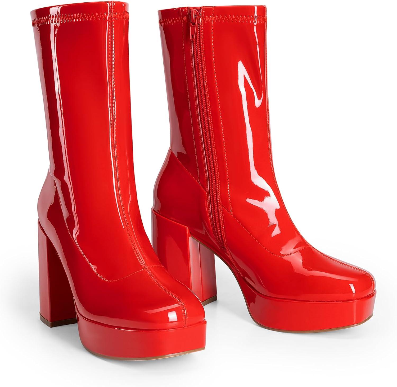 DREAM PAIRS Women’s Mid Calf Gogo Boots Platform High Chunky Block Heel Square Toe Ankle Boots(Red-pat)