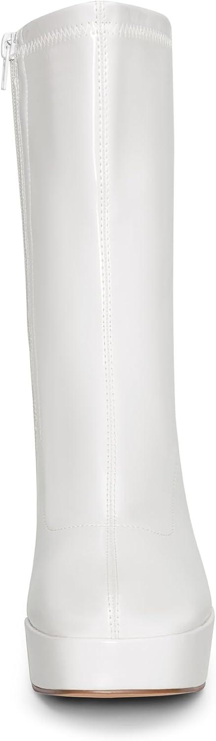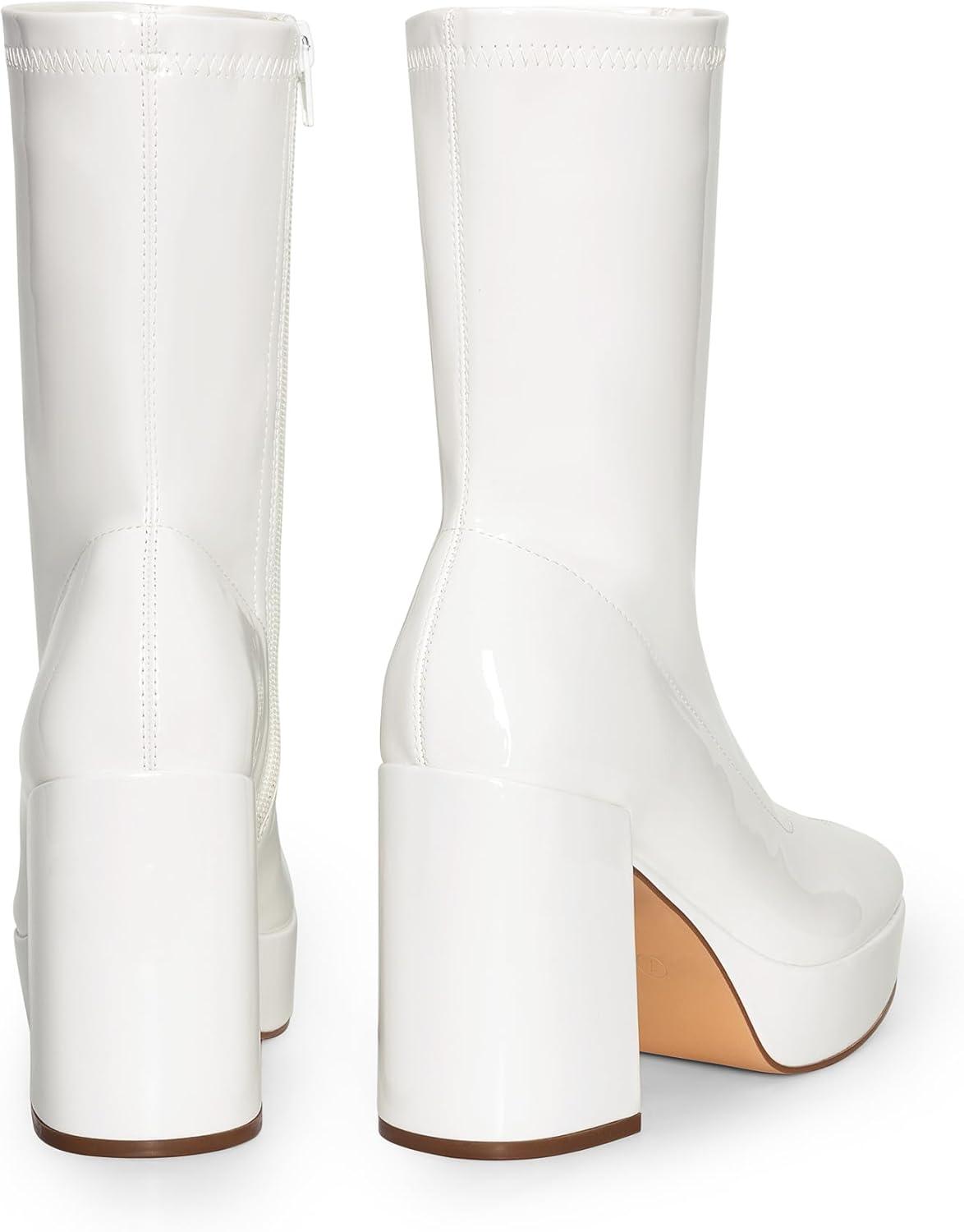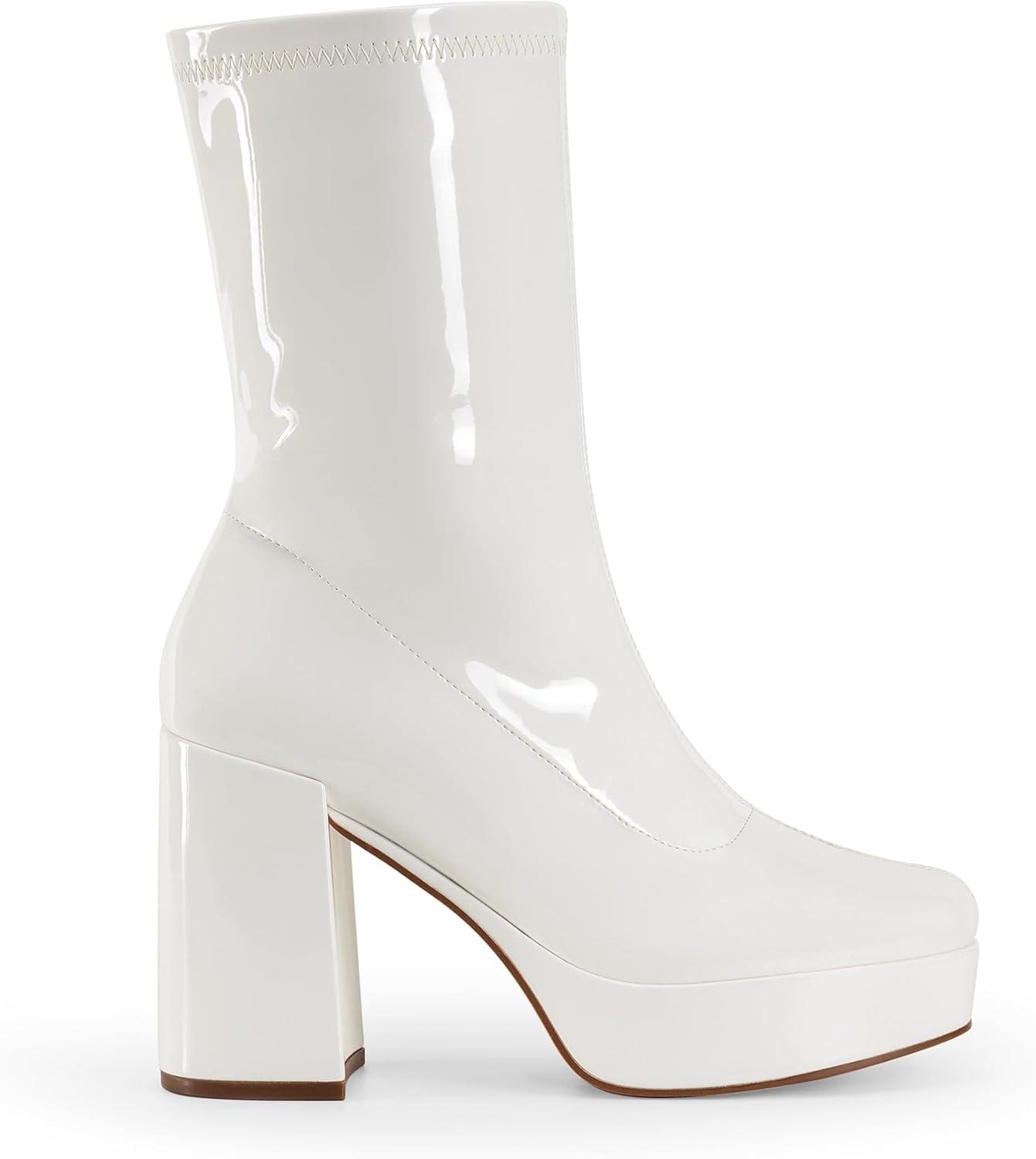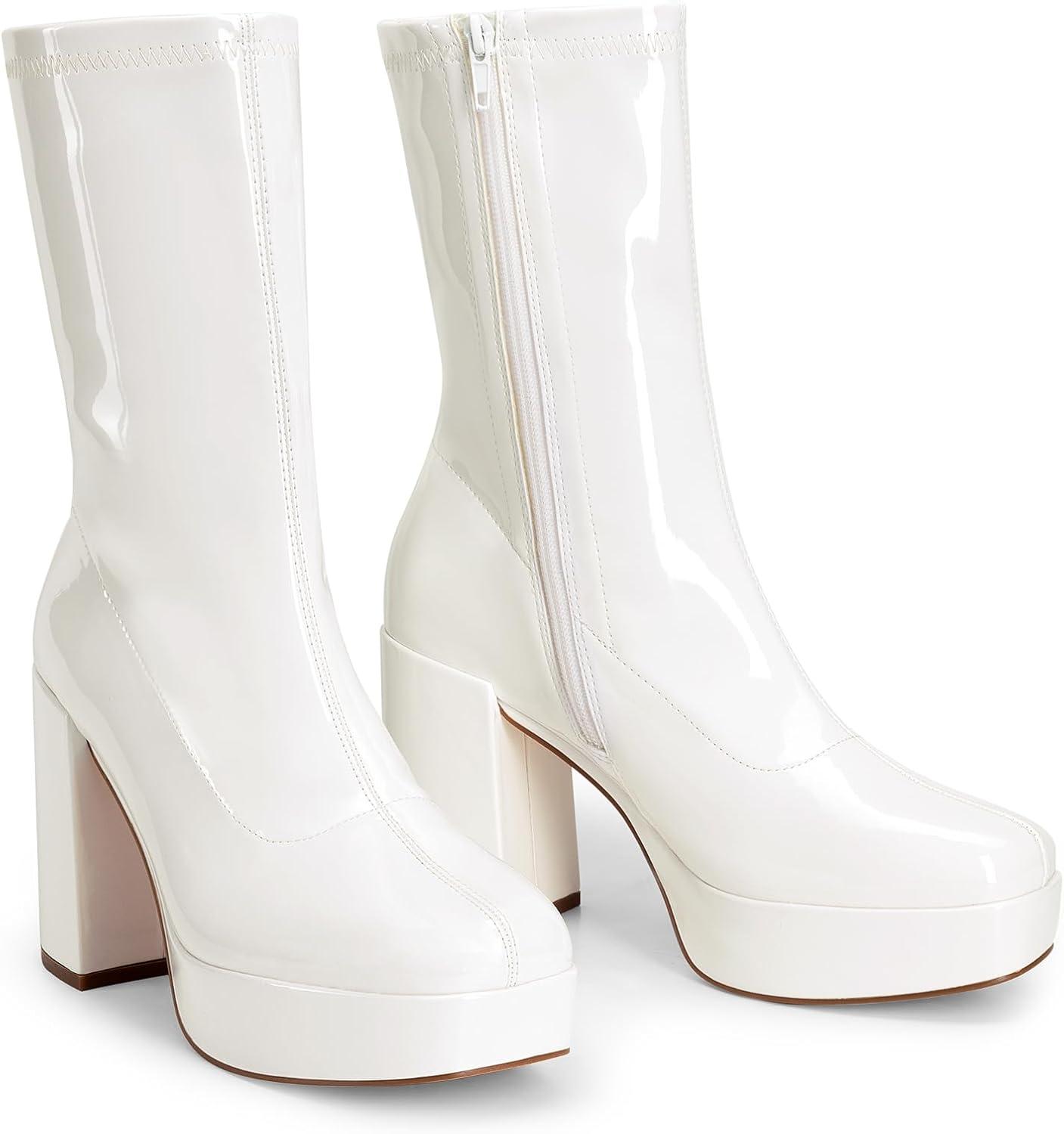 DREAM PAIRS Women’s Mid Calf Gogo Boots Platform High Chunky Block Heel Square Toe Ankle Boots(White-pat)
