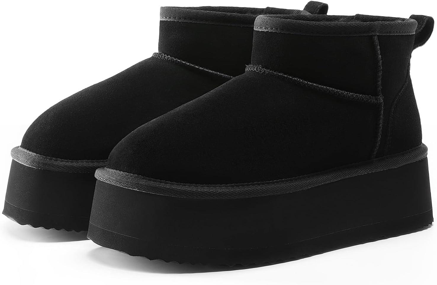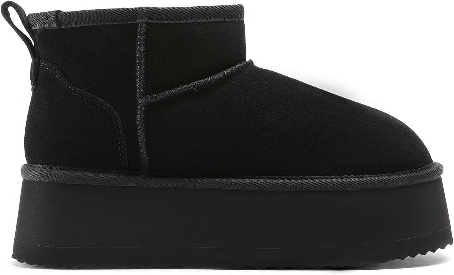 DREAM PAIRS Platform Winter Boots for Women Genuine Suede, Wide Toe Water Slip Resistant Ankle Mini Snow Boots Lined Fur with Lightweigt Memory Foam Insole Outdoor(Black)