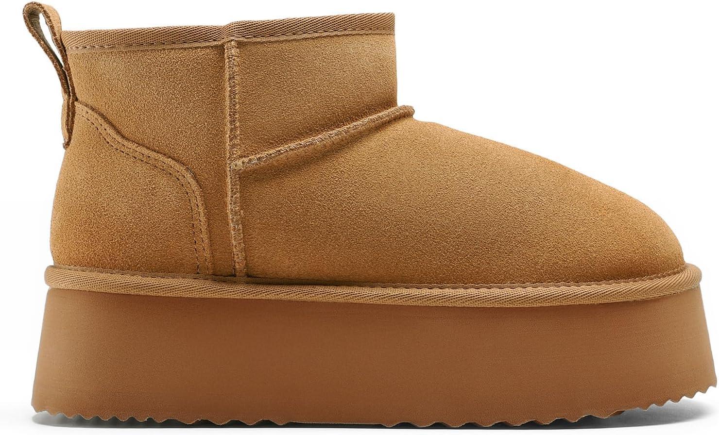 DREAM PAIRS Platform Winter Boots for Women Genuine Suede, Wide Toe Water Slip Resistant Ankle Mini Snow Boots Lined Fur with Lightweigt Memory Foam Insole Outdoor(Chestnut)