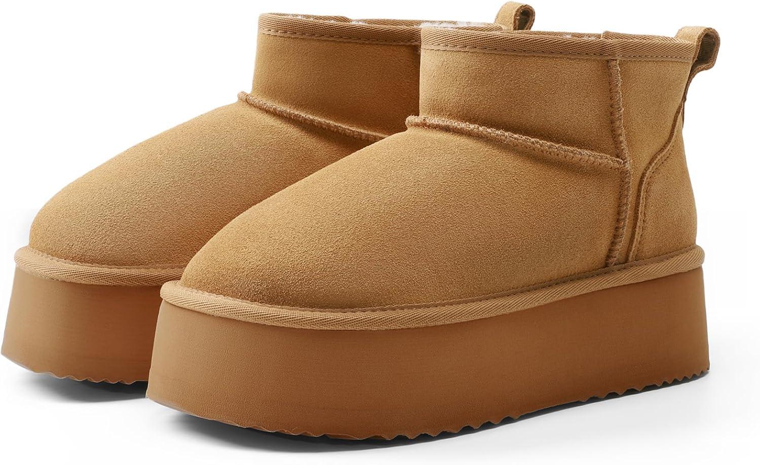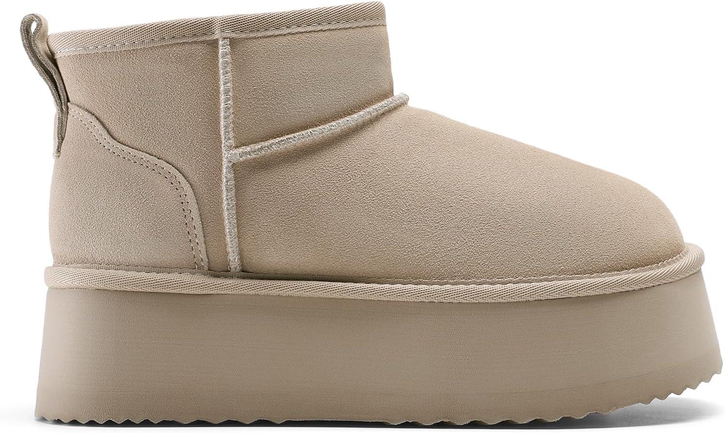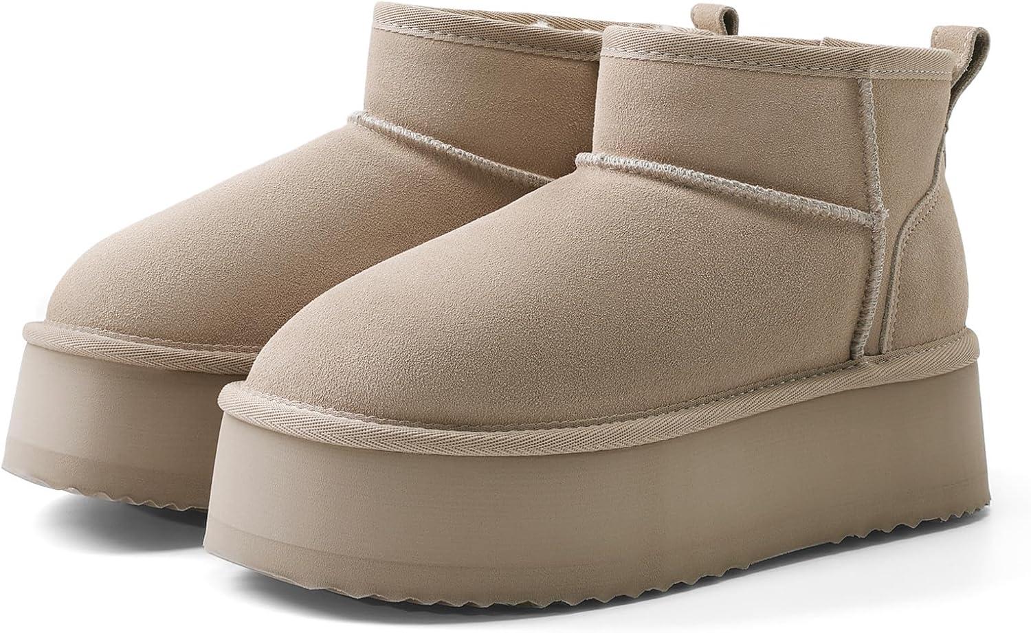 DREAM PAIRS Platform Winter Boots for Women Genuine Suede, Wide Toe Water Slip Resistant Ankle Mini Snow Boots Lined Fur with Lightweigt Memory Foam Insole Outdoor(Sand)