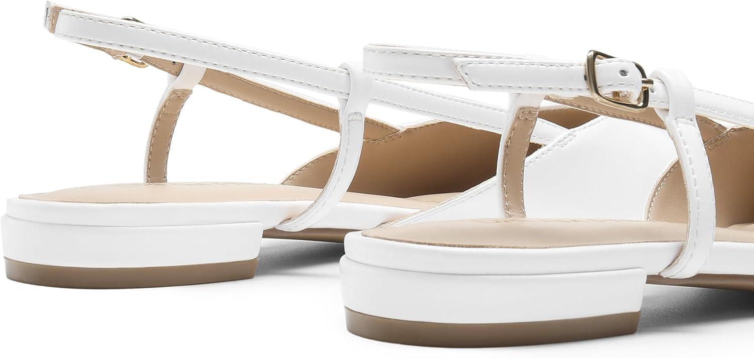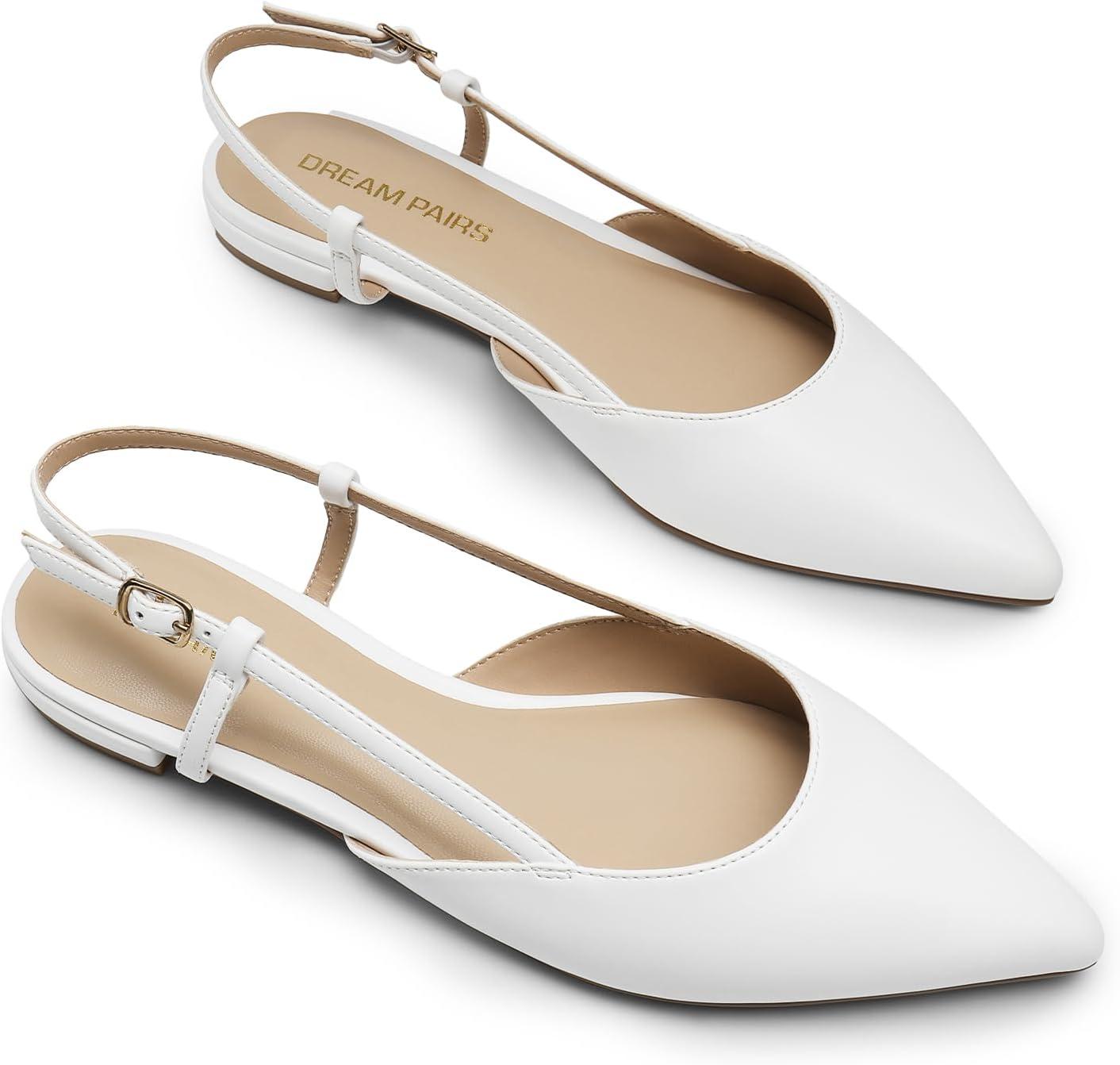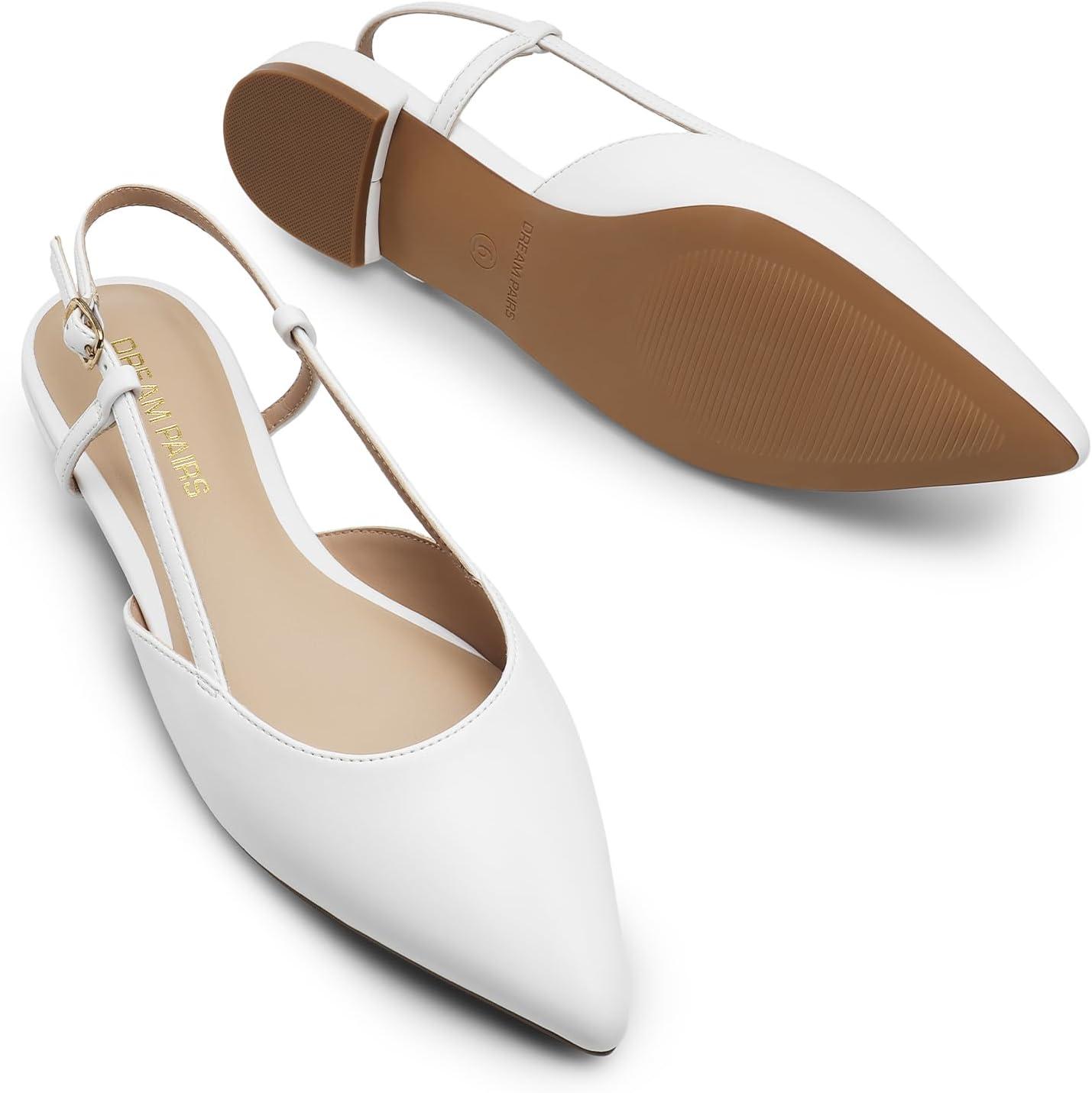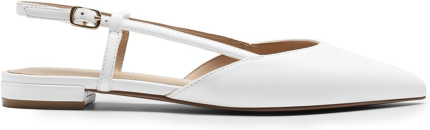 DREAM PAIRS Slingback Flats for Women, Pointed-Toe Elegant Women’s Ballet Flats with Buckle Strap, Classic Low Heel Dress Shoes for Casual Work Office Party(White-pu)