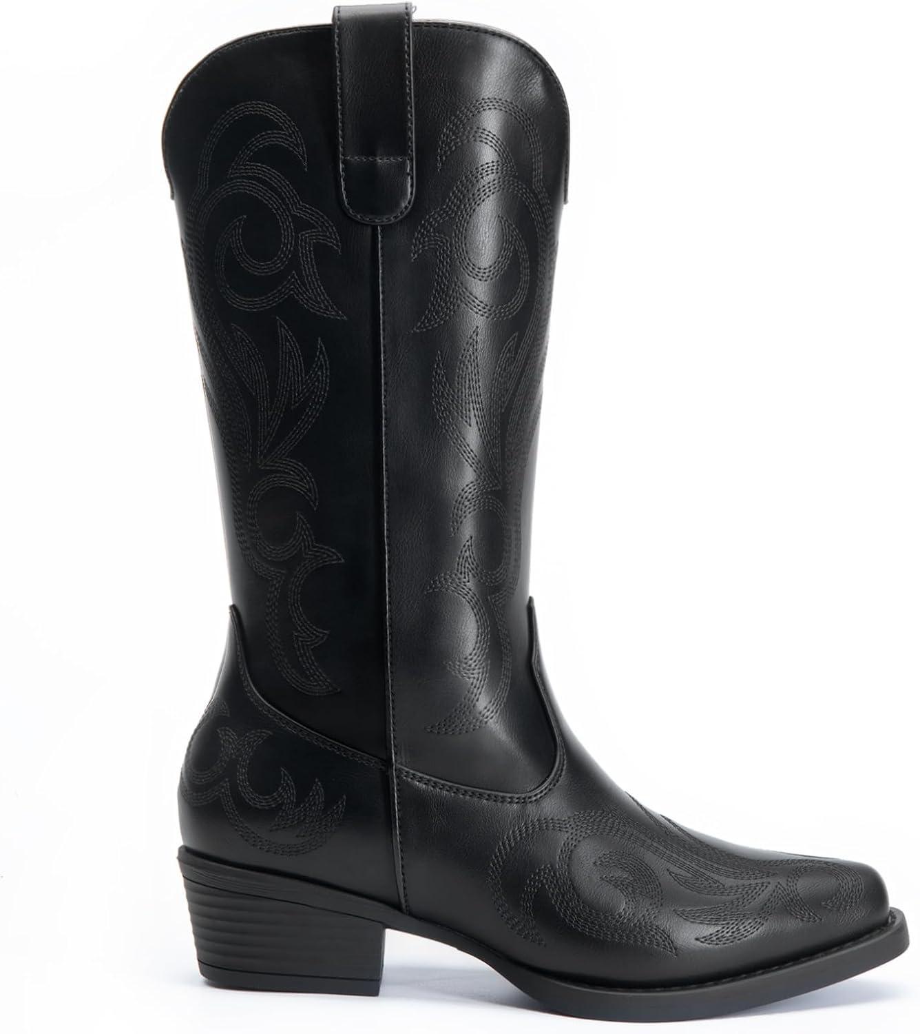 DREAM PAIRS Women’s Cowboy Boots Mid Calf Cowgirl Boots Square Toe Chunky Heel Embroidery Stitched Western Boots(Black)