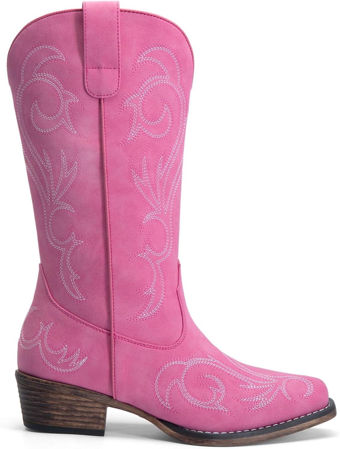 DREAM PAIRS Women’s Cowboy Boots Mid Calf Cowgirl Boots Square Toe Chunky Heel Embroidery Stitched Western Boots(Pink)