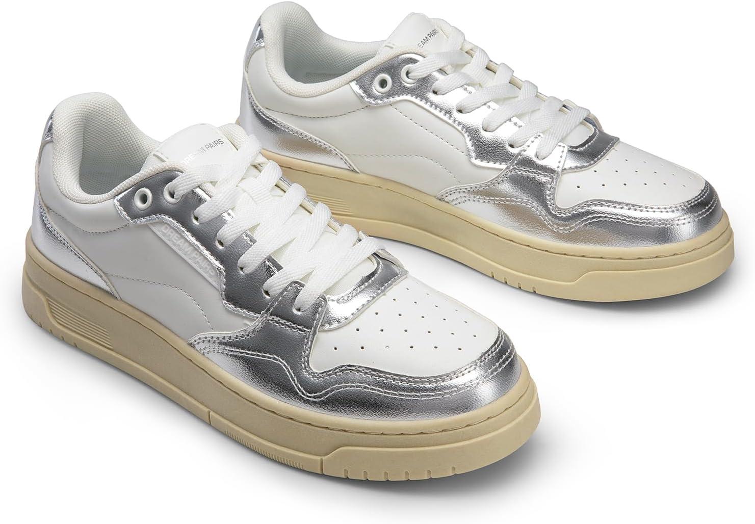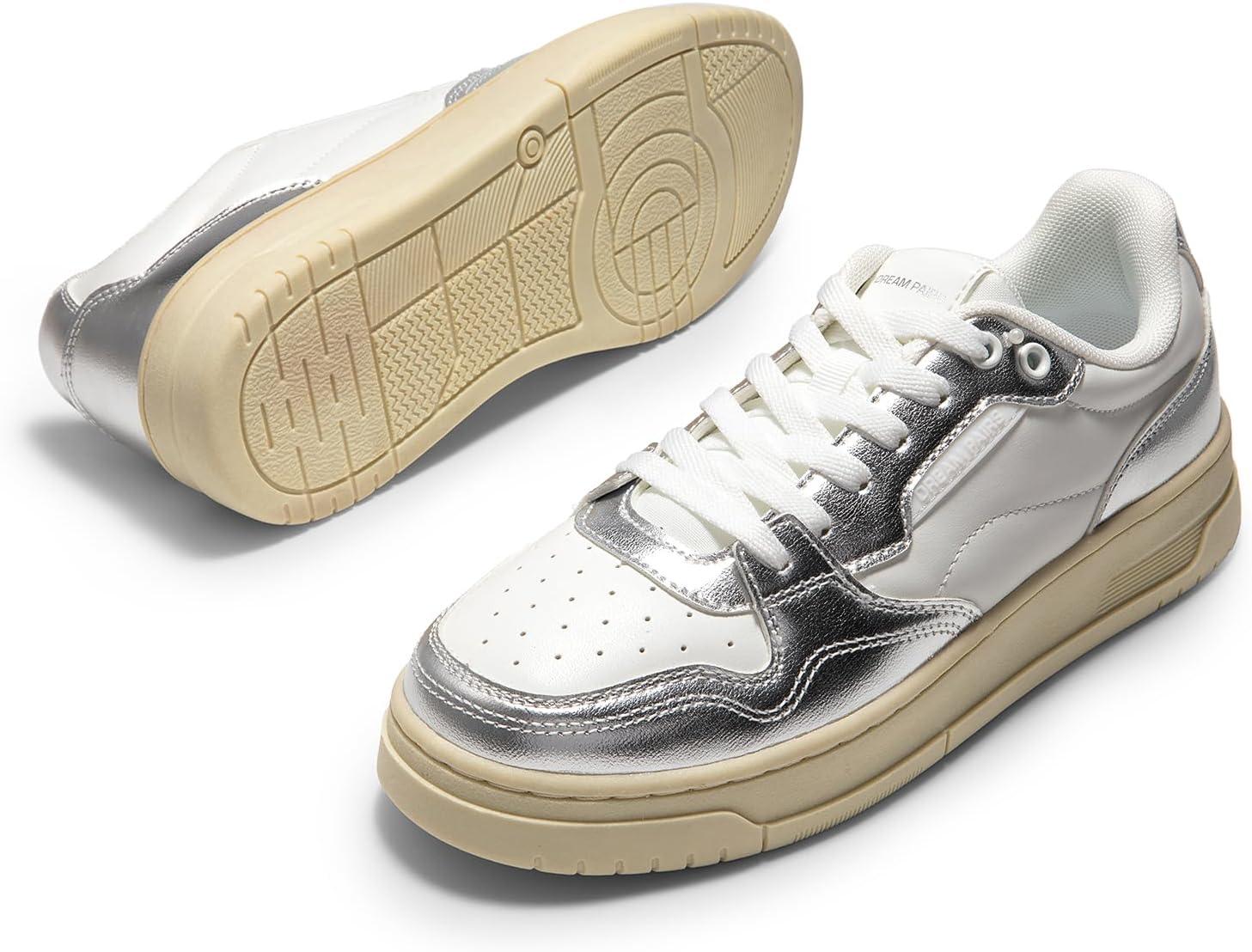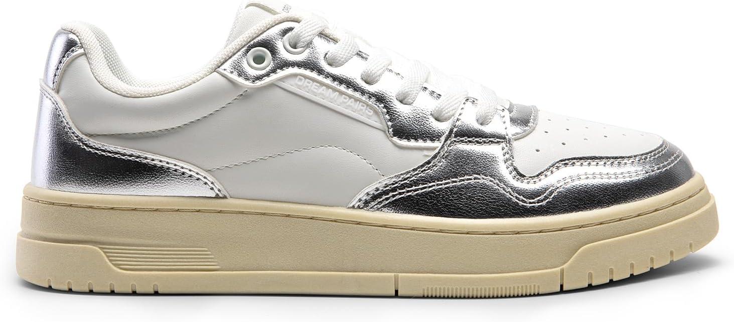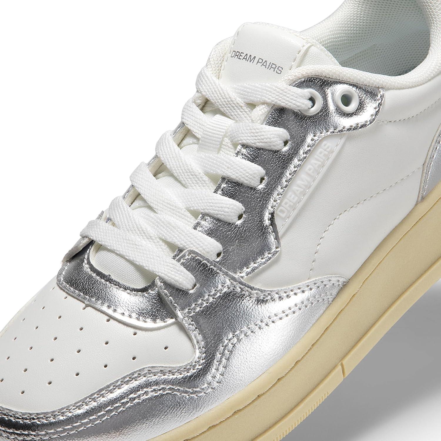 DREAM PAIRS Women’s Fashion Walking Skateboard Court Sneakers Comfortable Low-Top Lace-Up Non-Slip Retro Vintage Casual Classic Athletic Shoes(White/Silver)
