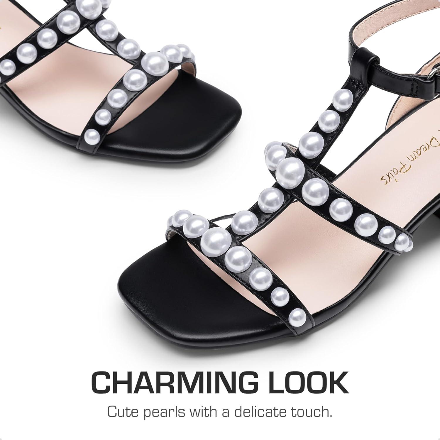 DREAM PAIRS Girls Sandals Ankle Strap T-Strap Low Heel Pearl Flower Pump Dress Wedding Party Square Toe Shoes for Little Kid/Big Kid(Black)