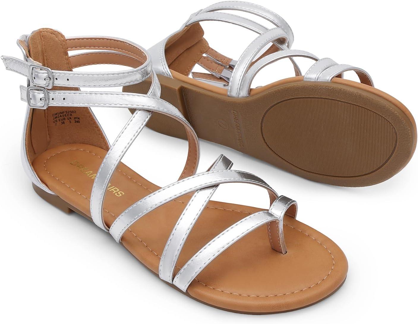 DREAM PAIRS Women’s Dressy Gladiator Summer Cross Strappy Sandals Comfort Flat Casual Beach Fisherman Thong sandals(Silver)