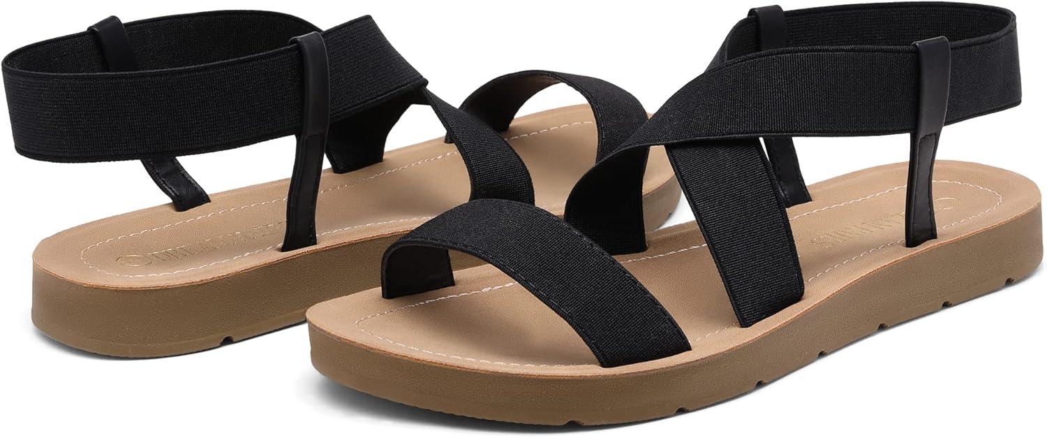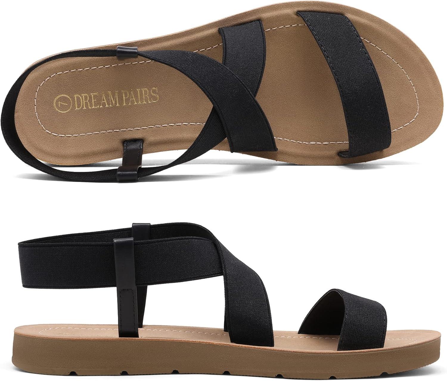 DREAM PAIRS Women’s Open Toe Elastic Ankle Strap Flat Summer Sandals(All Black-elastic)