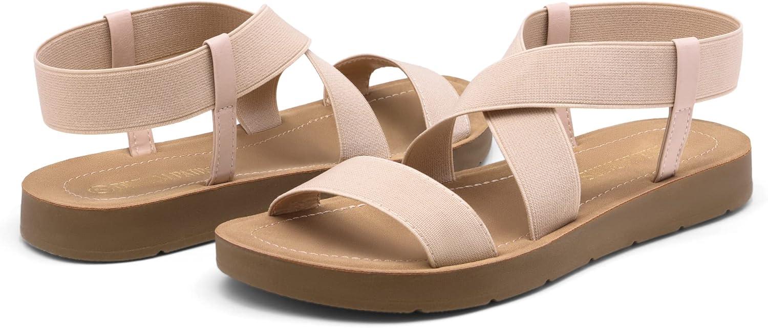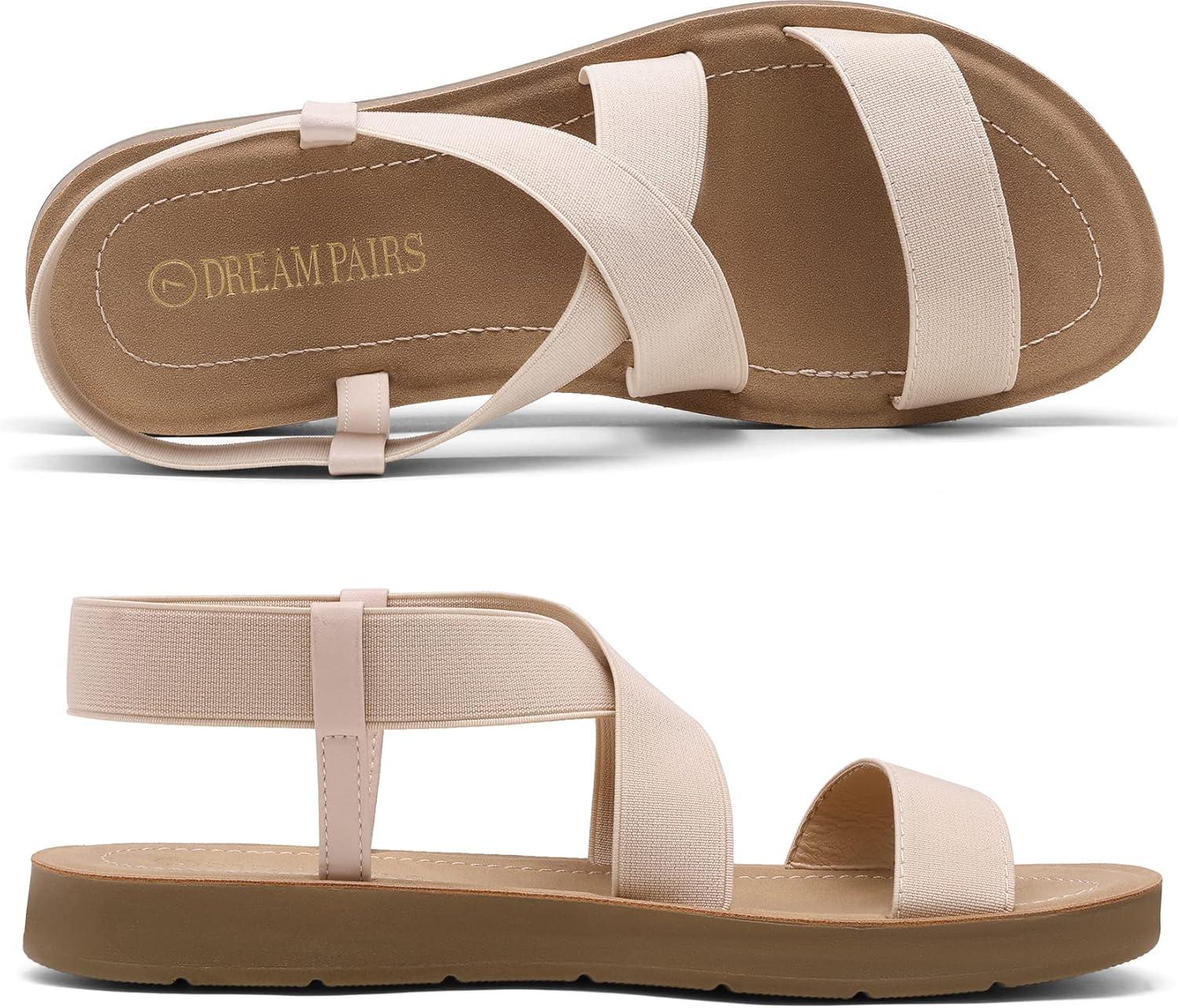 DREAM PAIRS Women’s Open Toe Elastic Ankle Strap Flat Summer Sandals(Nude)