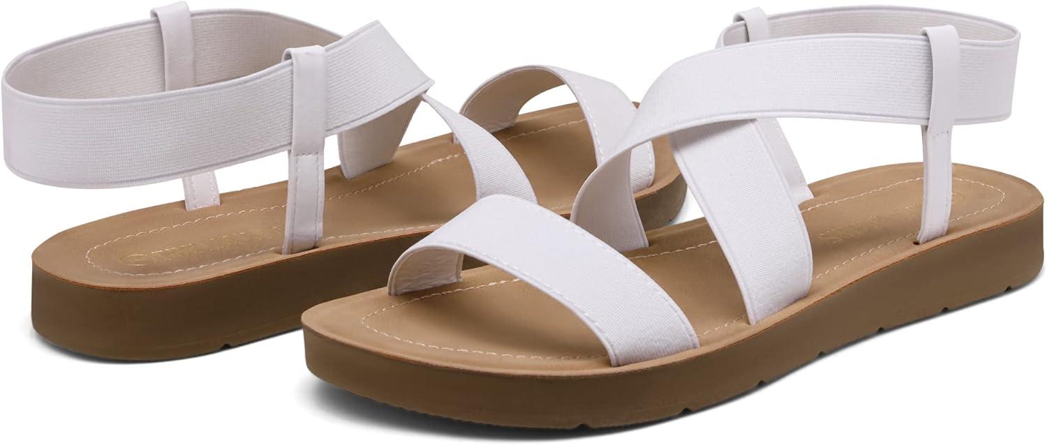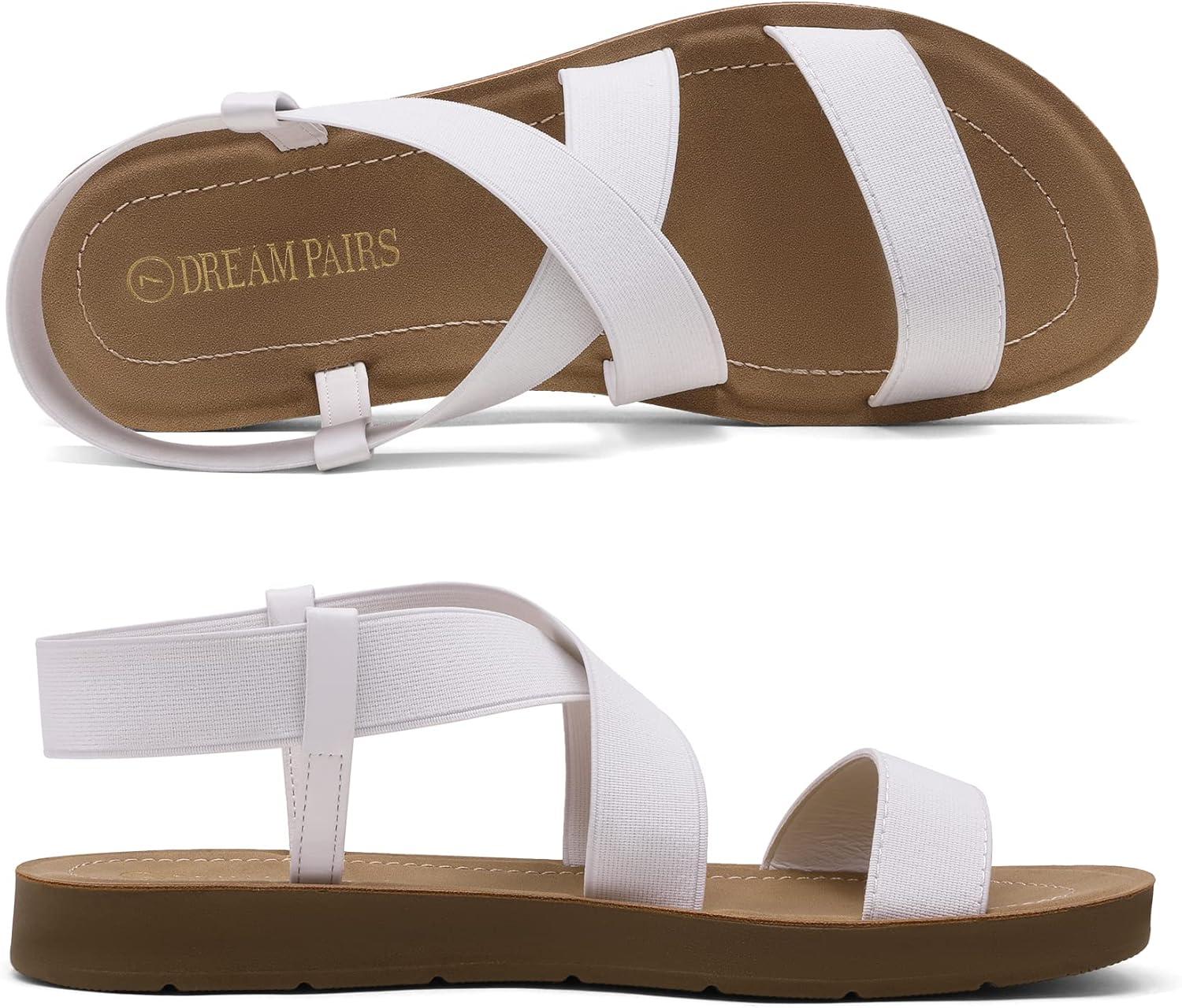 DREAM PAIRS Women’s Open Toe Elastic Ankle Strap Flat Summer Sandals(White)