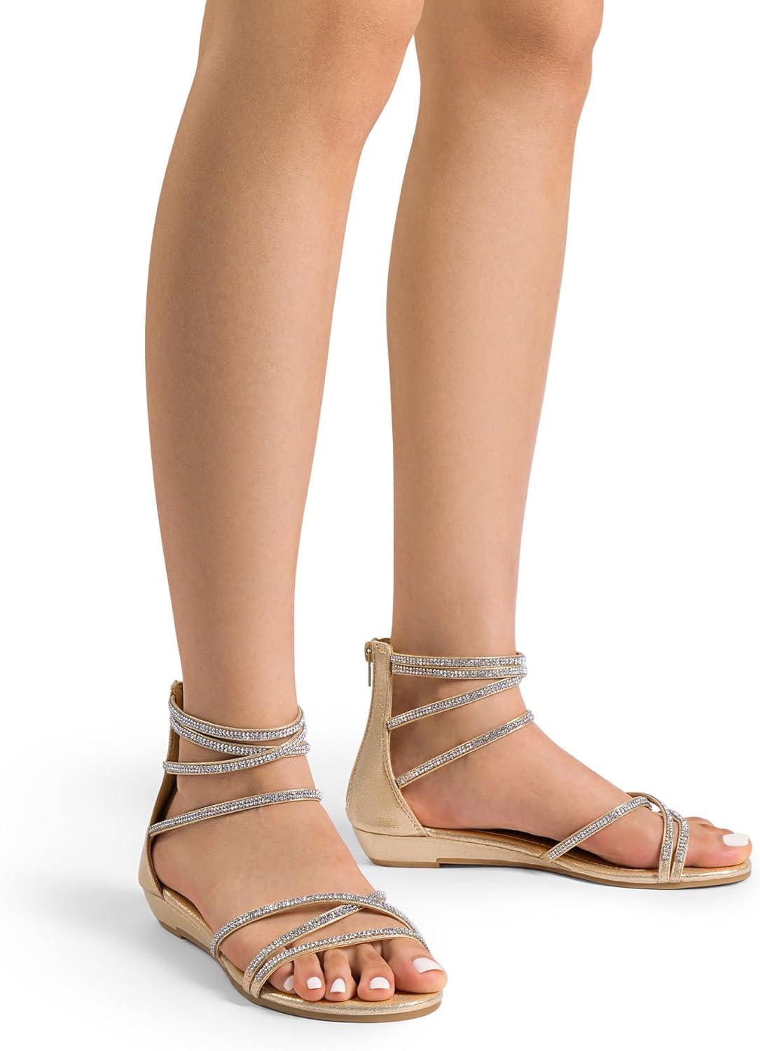 DREAM PAIRS Women’s Ankle Strap Flat Sandals Summer Dressy Strappy Gladiator Rhinestones Sandals(Champagne/Gold-pu)