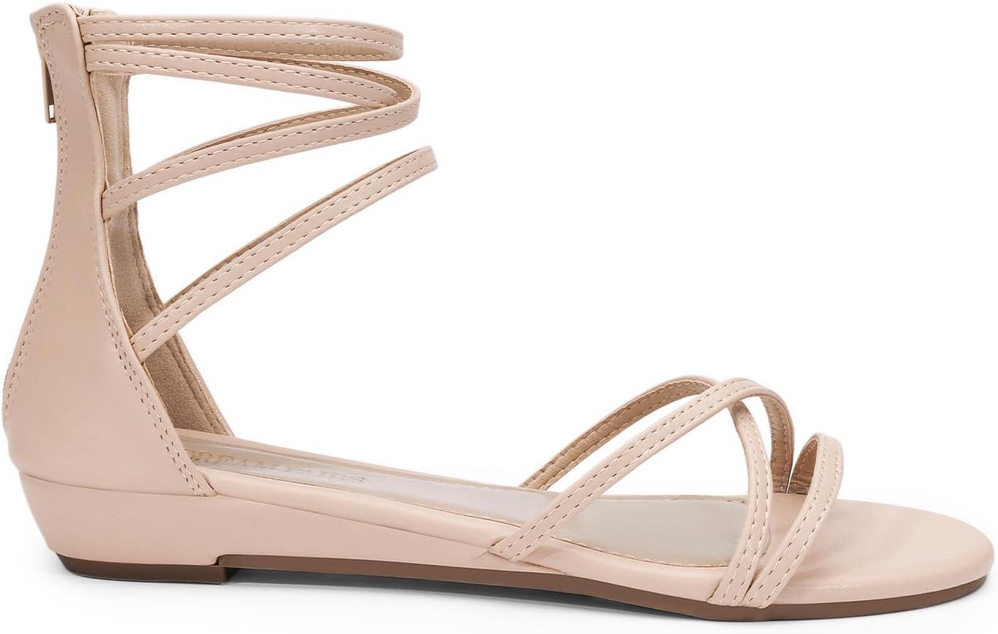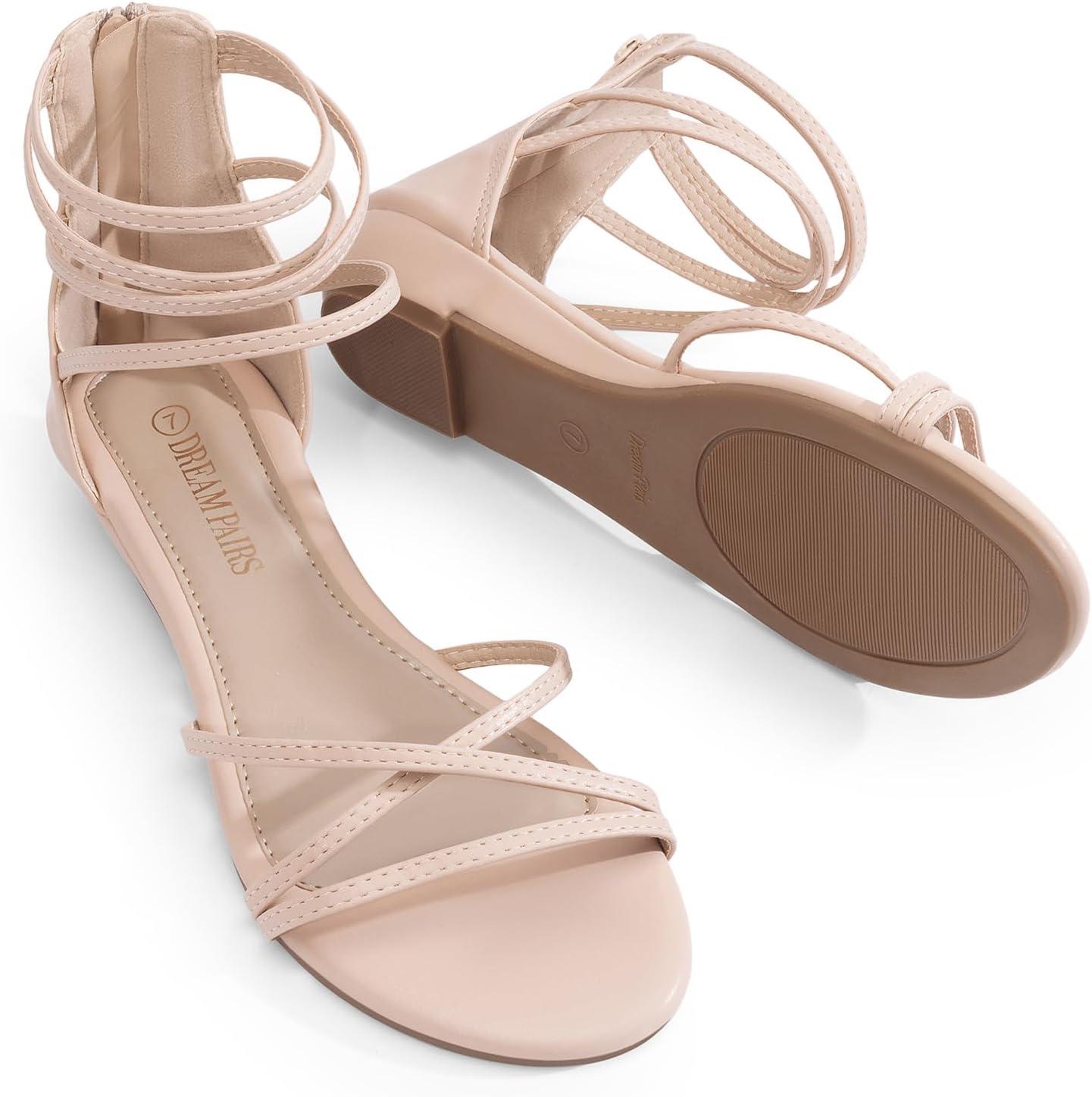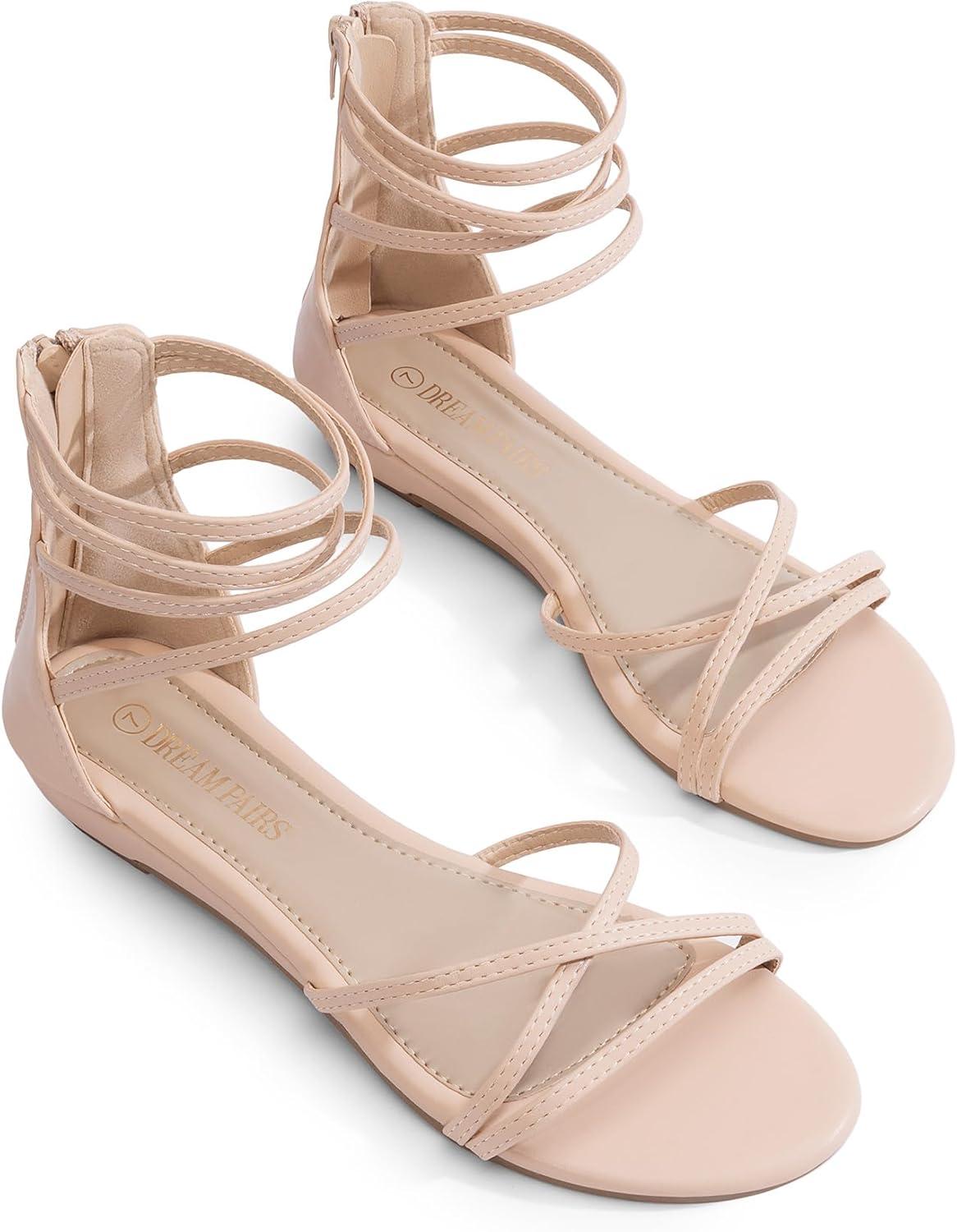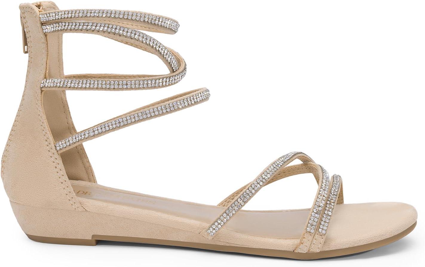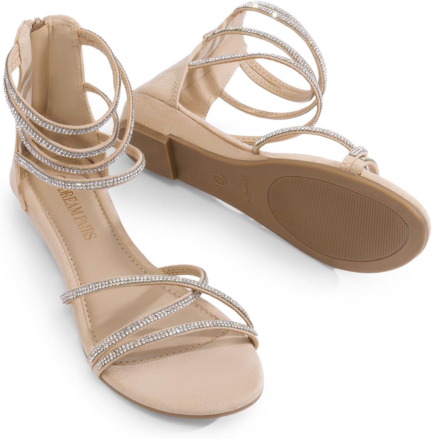 DREAM PAIRS Women’s Ankle Strap Flat Sandals Summer Dressy Strappy Gladiator Rhinestones Sandals(Nude/Pu)
