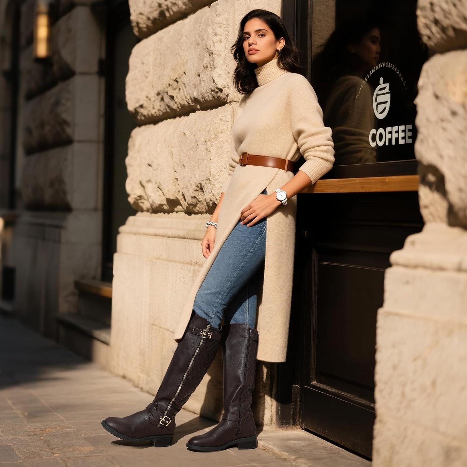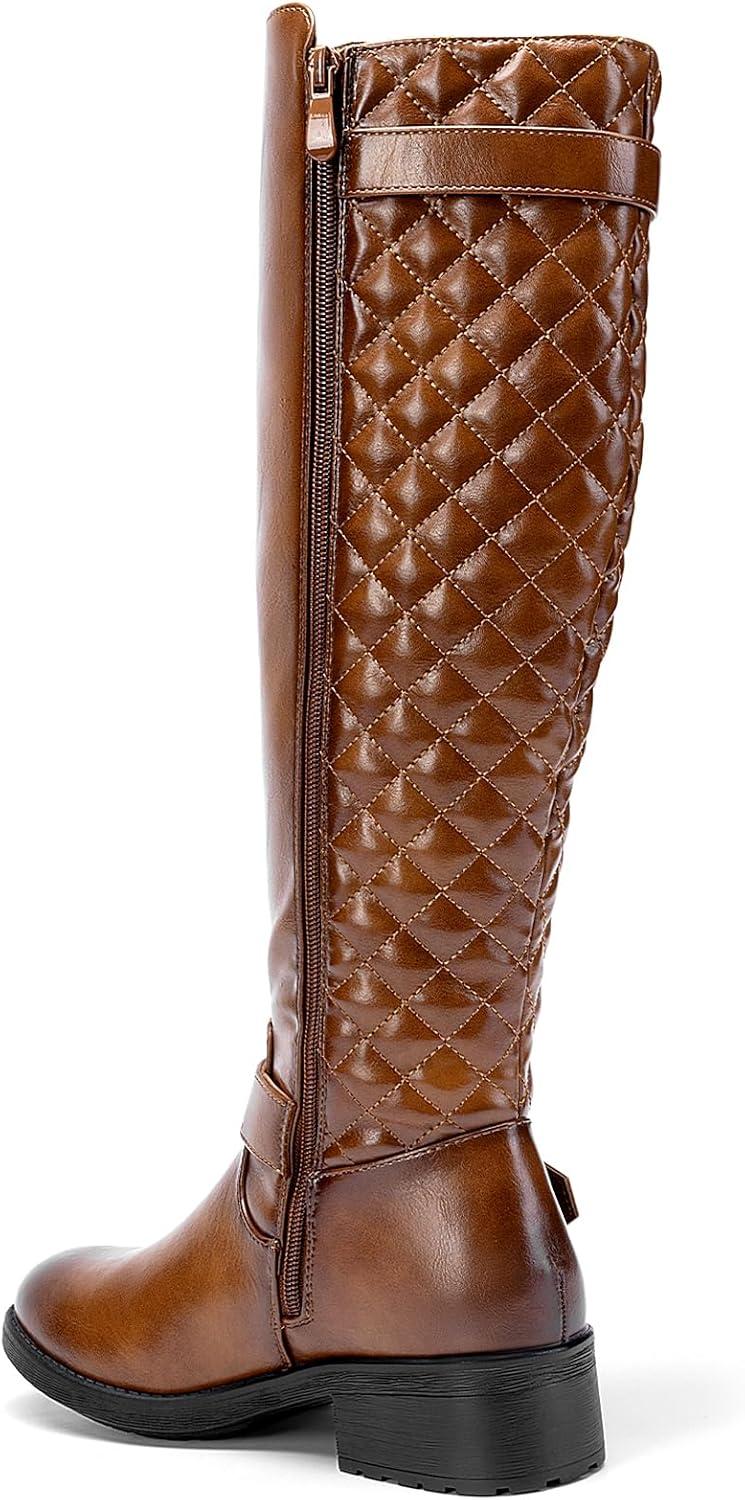 DREAM PAIRS Women’s Knee-High Boots Comfortable Chunky Block Heel Round Toe Side Zipper Riding Fashion Buckles Biker Motorcycle Boots(Light Brown)