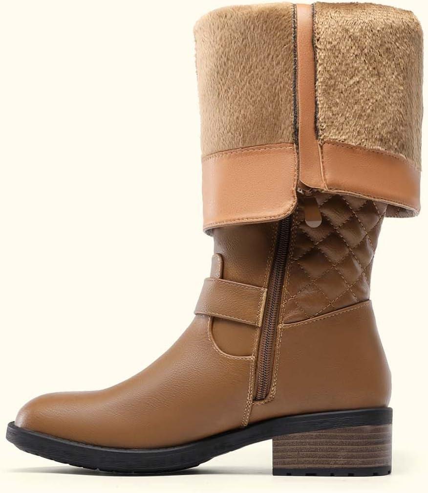 DREAM PAIRS Women’s Knee-High Boots Comfortable Chunky Block Heel Round Toe Side Zipper Riding Fashion Buckles Biker Motorcycle Boots(Camel)