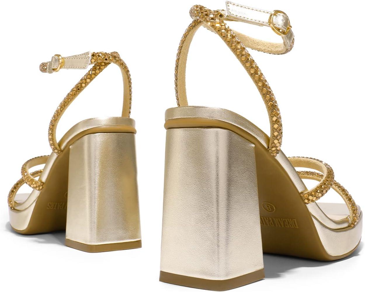 DREAM PAIRS Women’s Platform Strappy Heels Open Toe Ankle Strap Square Party Sandals Y2K Dress Shoes(Champagne-rhinestone)