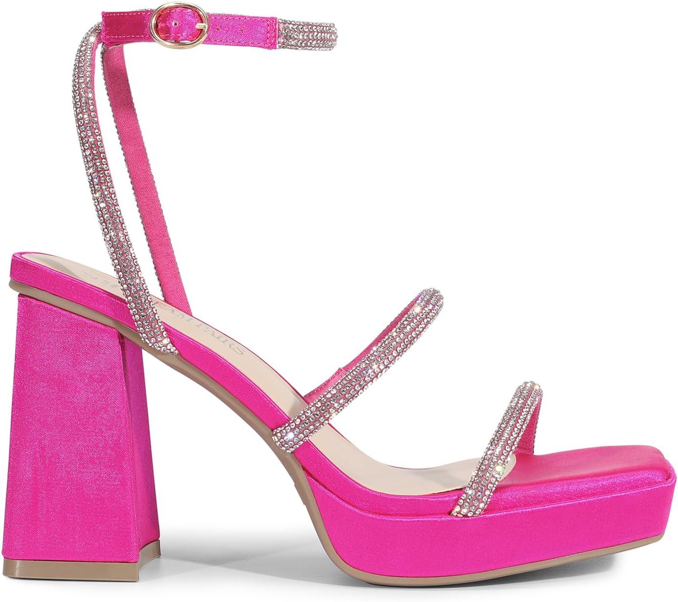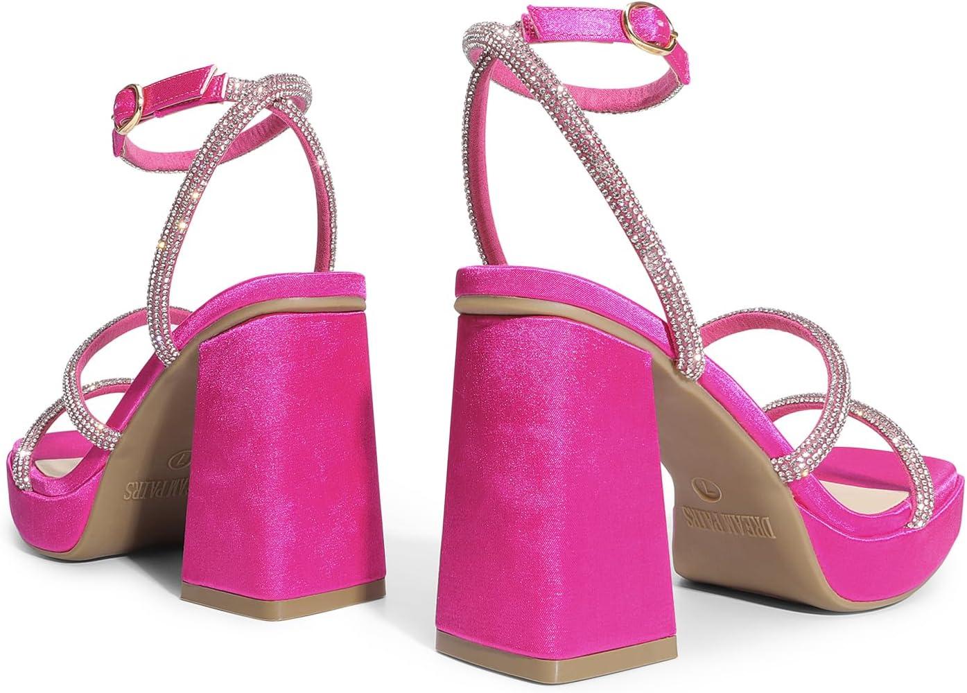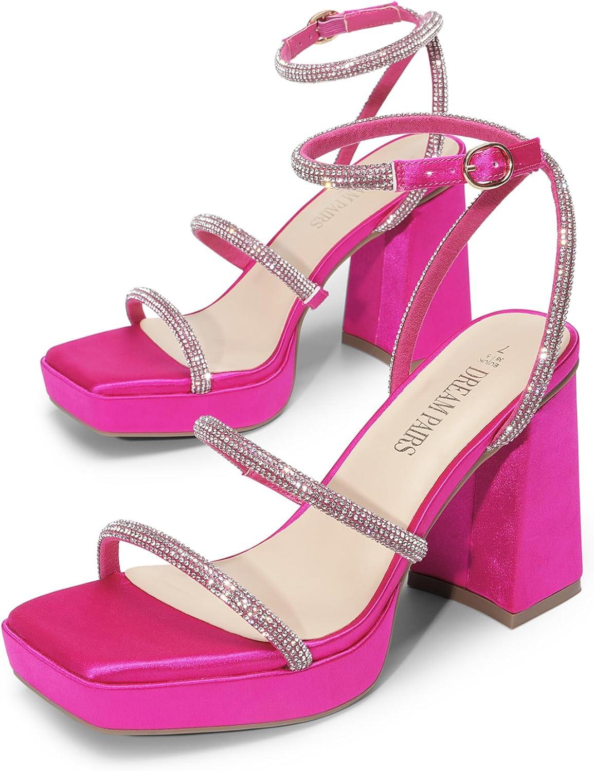 DREAM PAIRS Women’s Platform Strappy Heels Open Toe Ankle Strap Square Party Sandals Y2K Dress Shoes(Hot Pink-rhinestone)