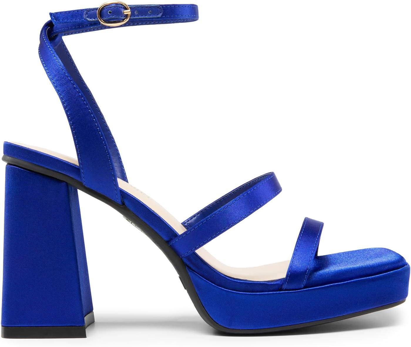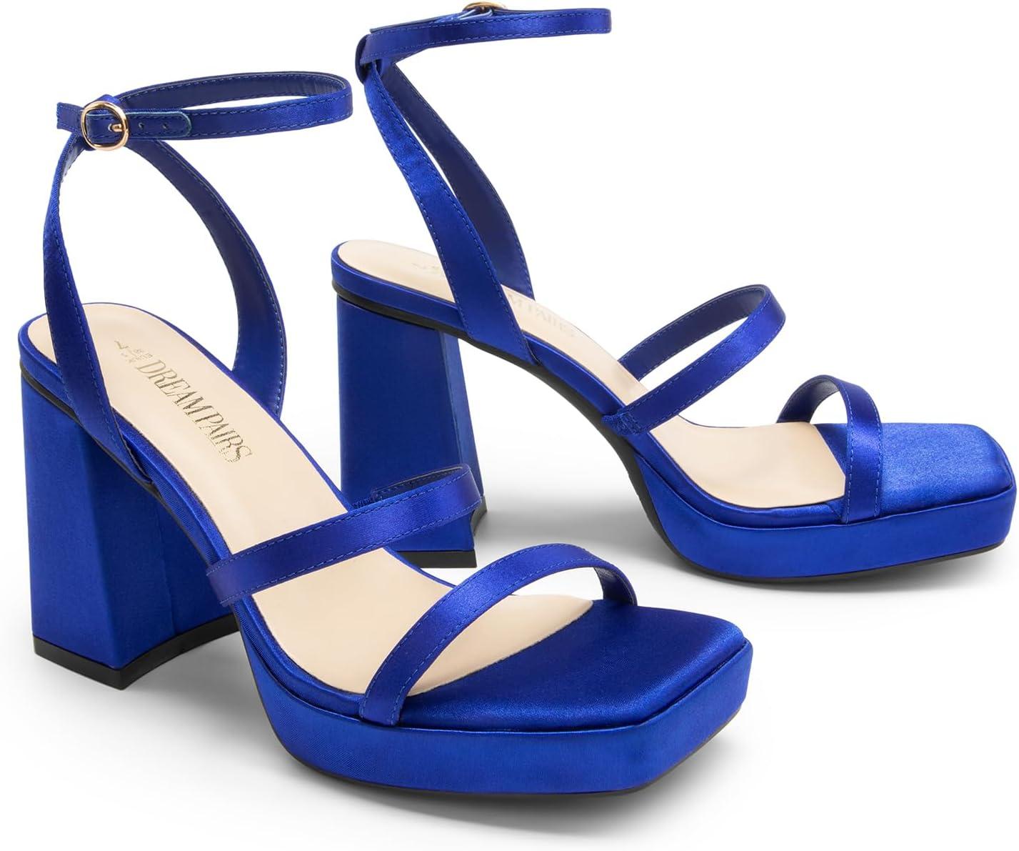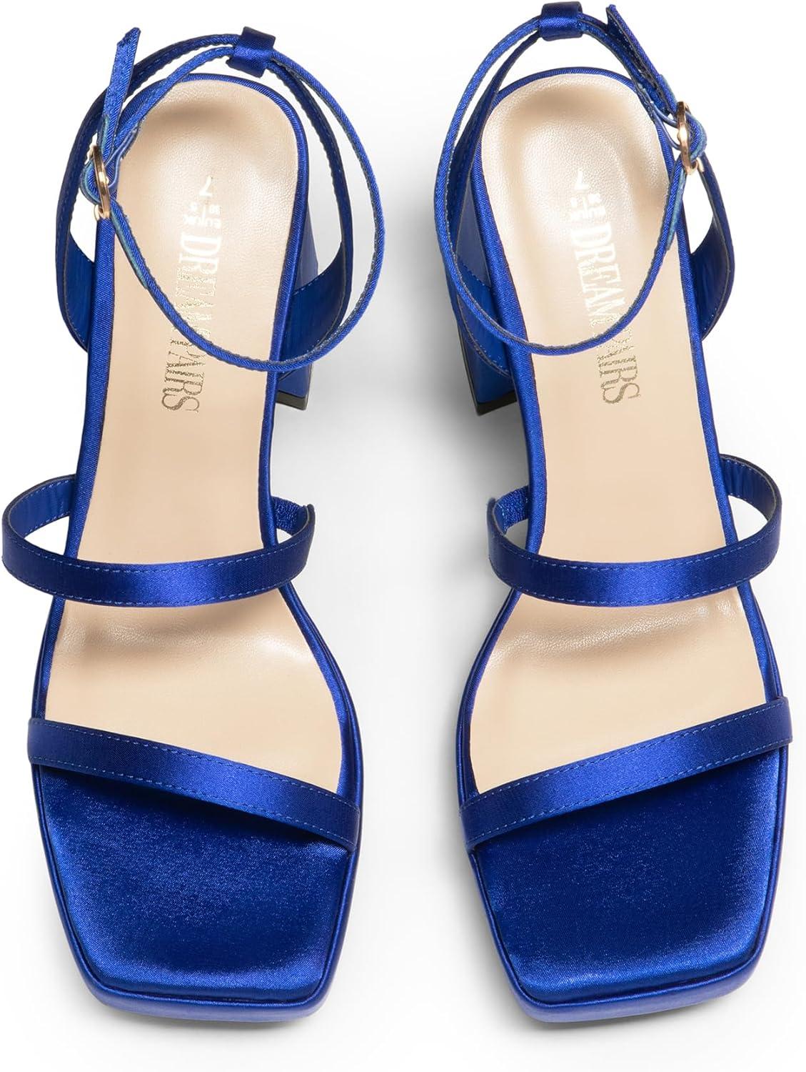 DREAM PAIRS Women’s Platform Strappy Heels Open Toe Ankle Strap Square Party Sandals Y2K Dress Shoes(Royal Blue-satin)