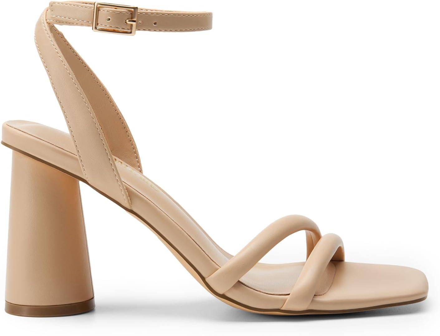 DREAM PAIRS Women’s Strappy Round Heels Open Square Toe Ankle Strap Party Sandals Dress Shoes(Nude-pu)
