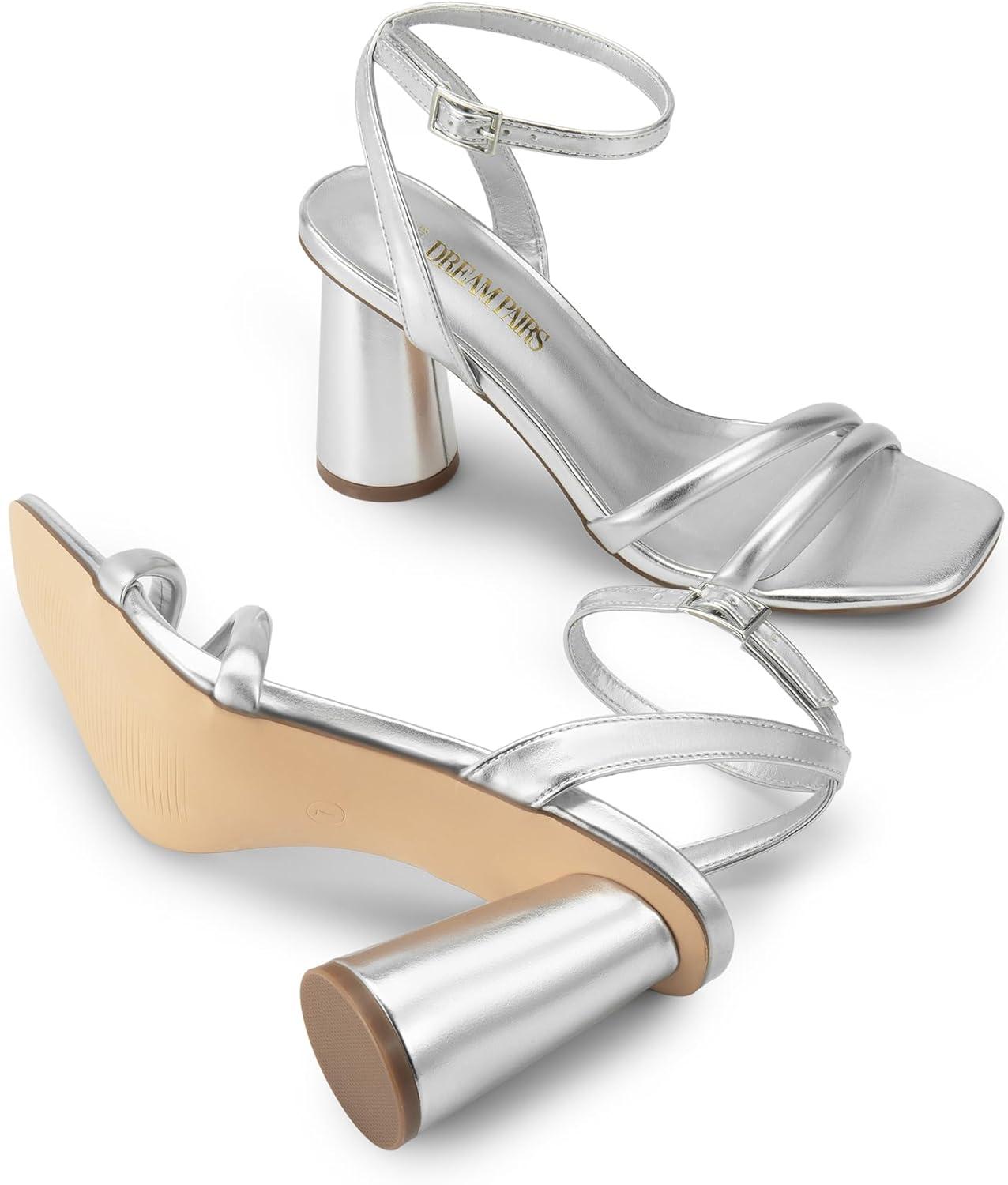 DREAM PAIRS Women’s Strappy Round Heels Open Square Toe Ankle Strap Party Sandals Dress Shoes(Silver-pu)