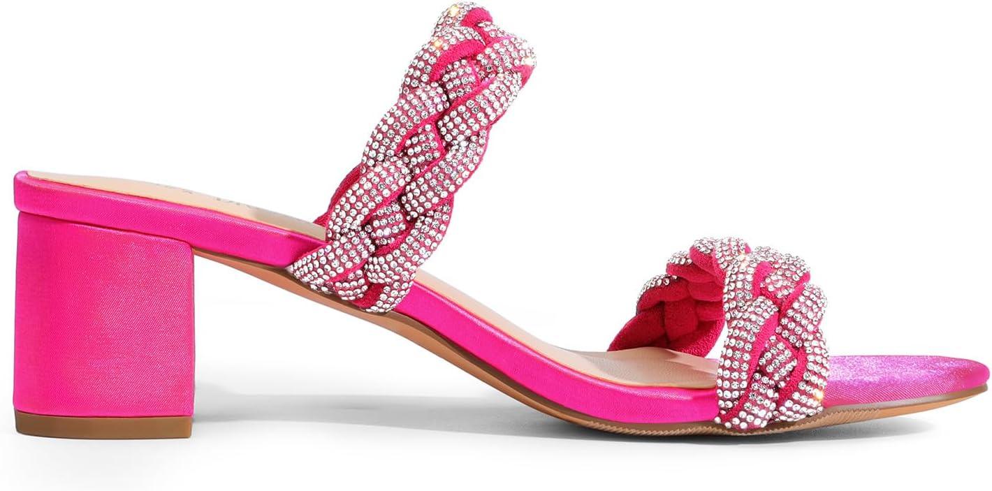DREAM PAIRS Women’s Two Braided Strap Low Heels for Women Open Toe Block Chunky Heels Sandals Holiday Party Wedding Dress Pumps Shoes(Hot Pink-rhinestone)