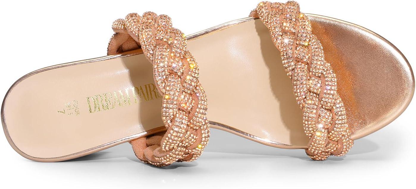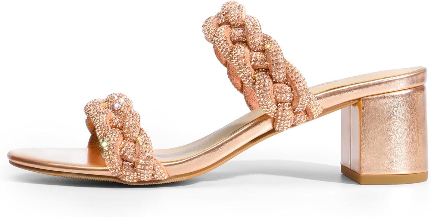 DREAM PAIRS Women’s Two Braided Strap Low Heels for Women Open Toe Block Chunky Heels Sandals Holiday Party Wedding Dress Pumps Shoes(Rose Gold-rhinestone)