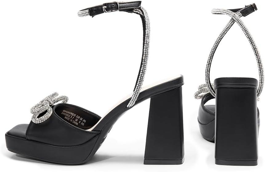 DREAM PAIRS Women’s Double Bowknots Platform Chunky Heels Rhinestone High Square Toe Dress Sandals for Wedding Bridal Party(Black-pu)