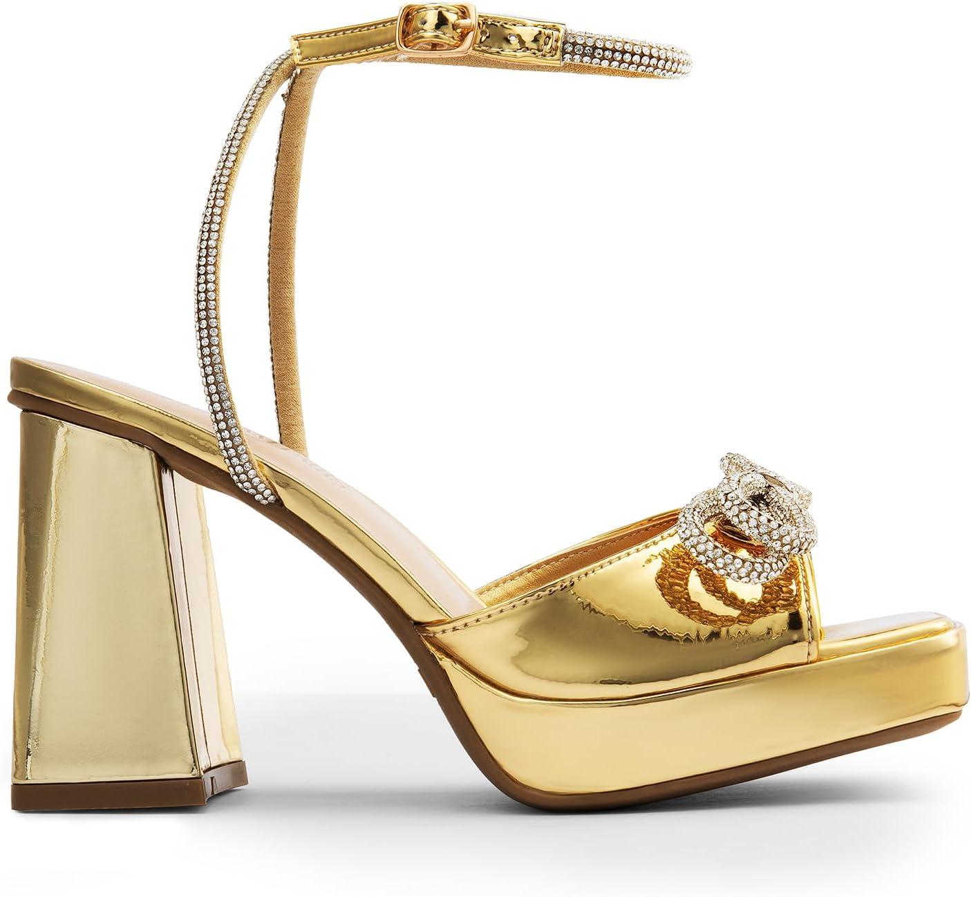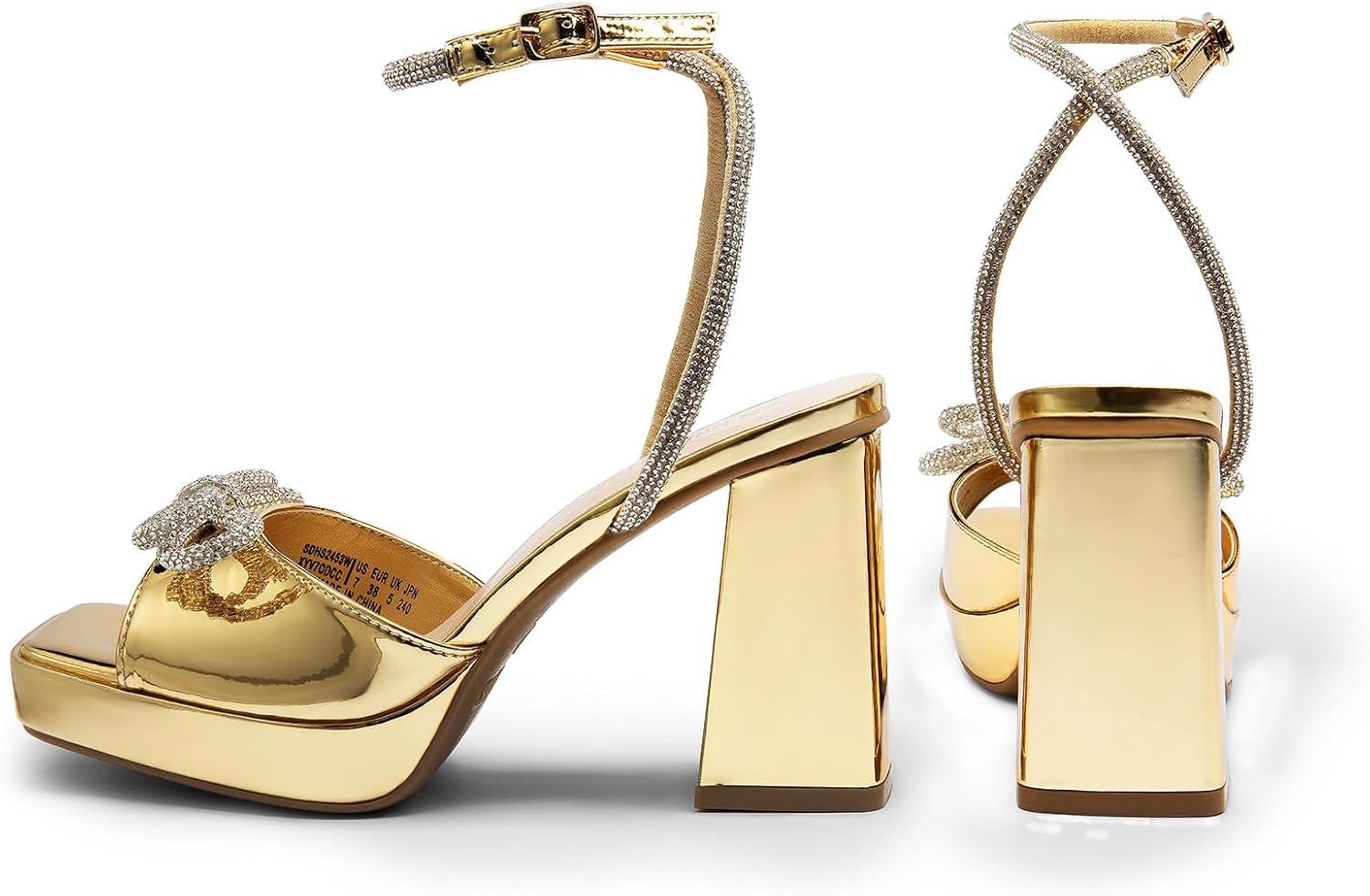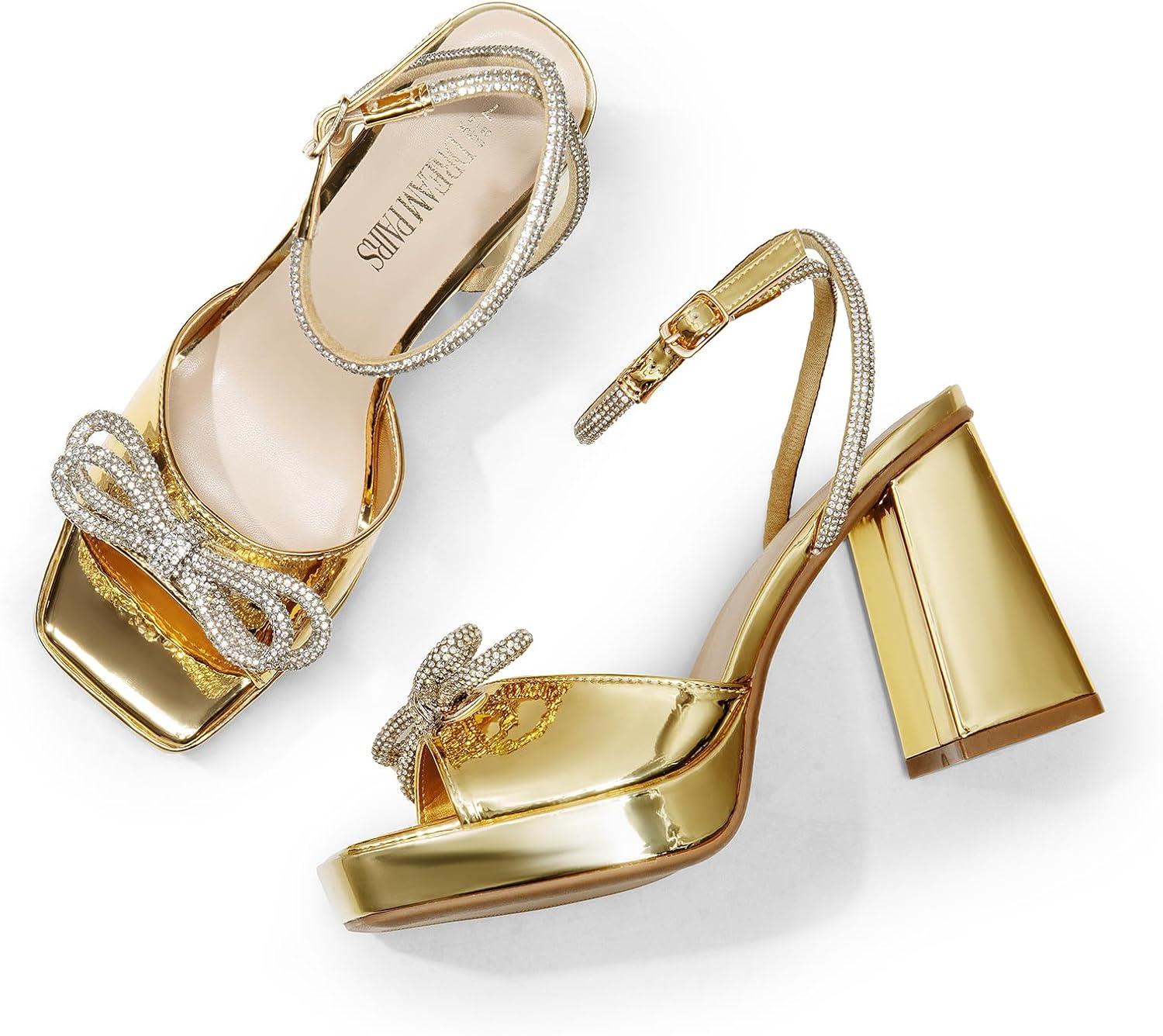 DREAM PAIRS Women’s Double Bowknots Platform Chunky Heels Rhinestone High Square Toe Dress Sandals for Wedding Bridal Party(Gold-pat)