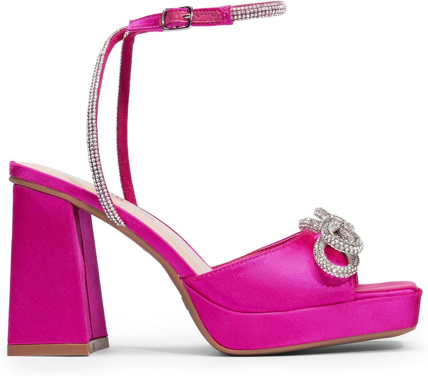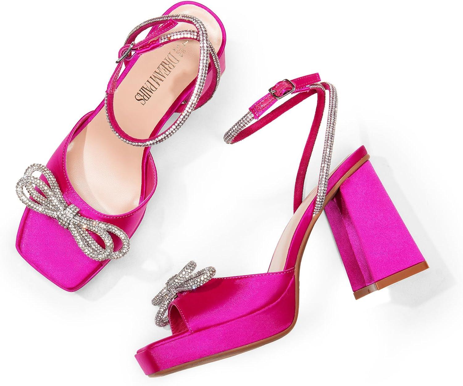 DREAM PAIRS Women’s Double Bowknots Platform Chunky Heels Rhinestone High Square Toe Dress Sandals for Wedding Bridal Party(Hot Pink-satin)