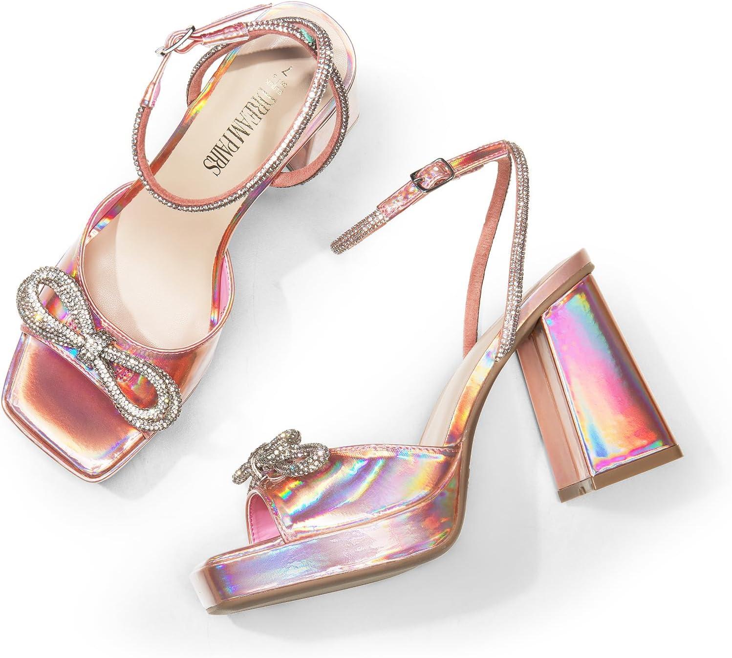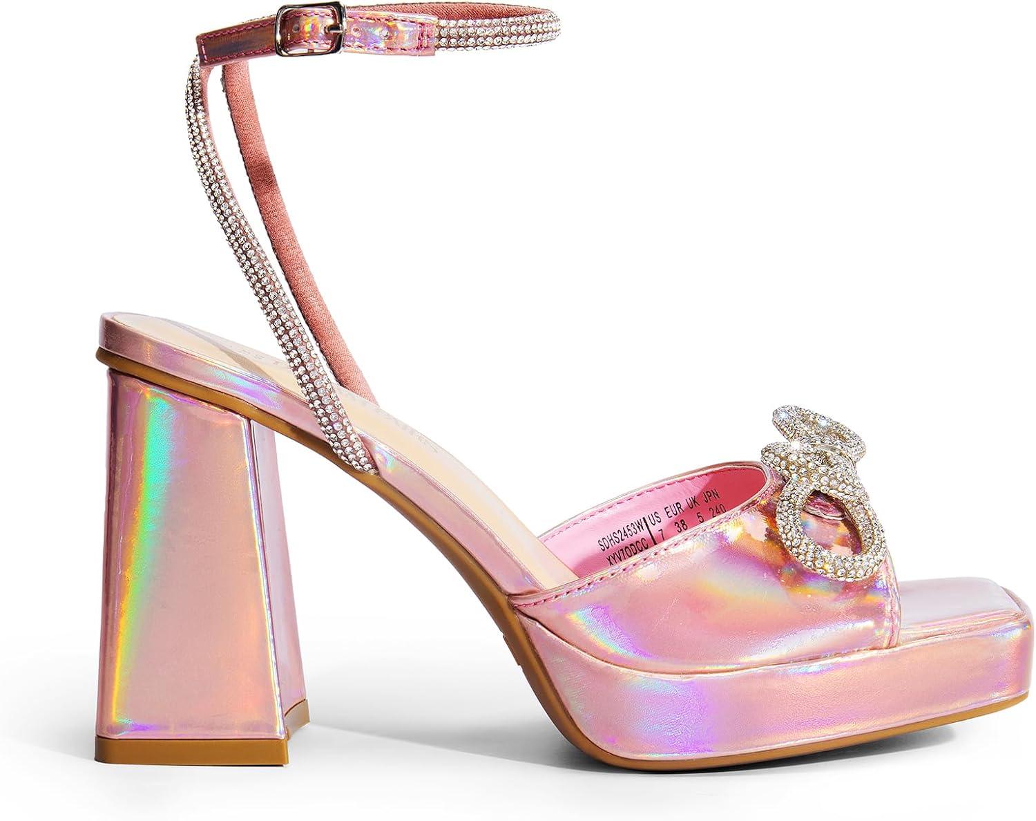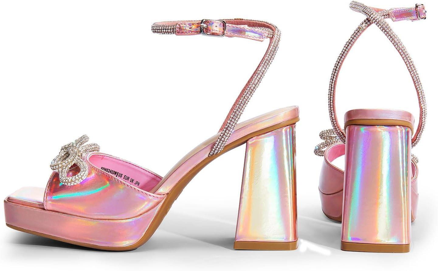 DREAM PAIRS Women’s Double Bowknots Platform Chunky Heels Rhinestone High Square Toe Dress Sandals for Wedding Bridal Party(Pink-pu)