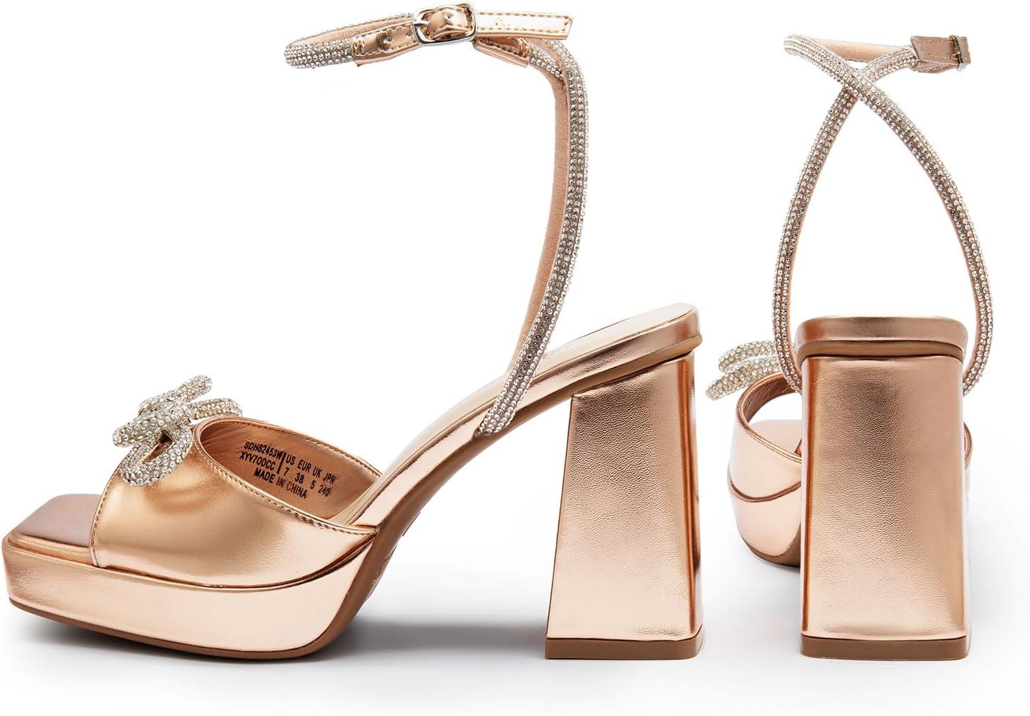 DREAM PAIRS Women’s Double Bowknots Platform Chunky Heels Rhinestone High Square Toe Dress Sandals for Wedding Bridal Party(Rose Gold-pu)