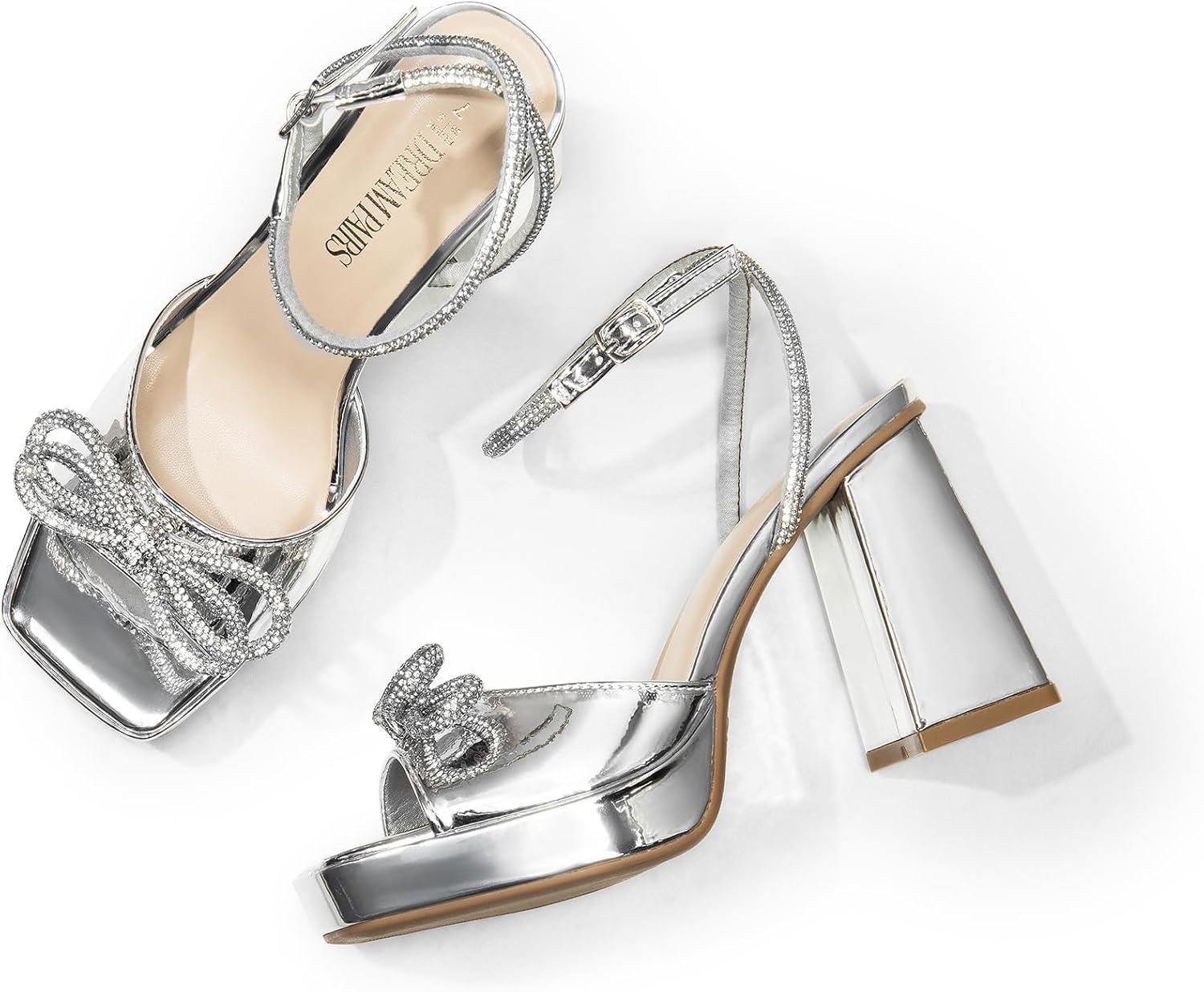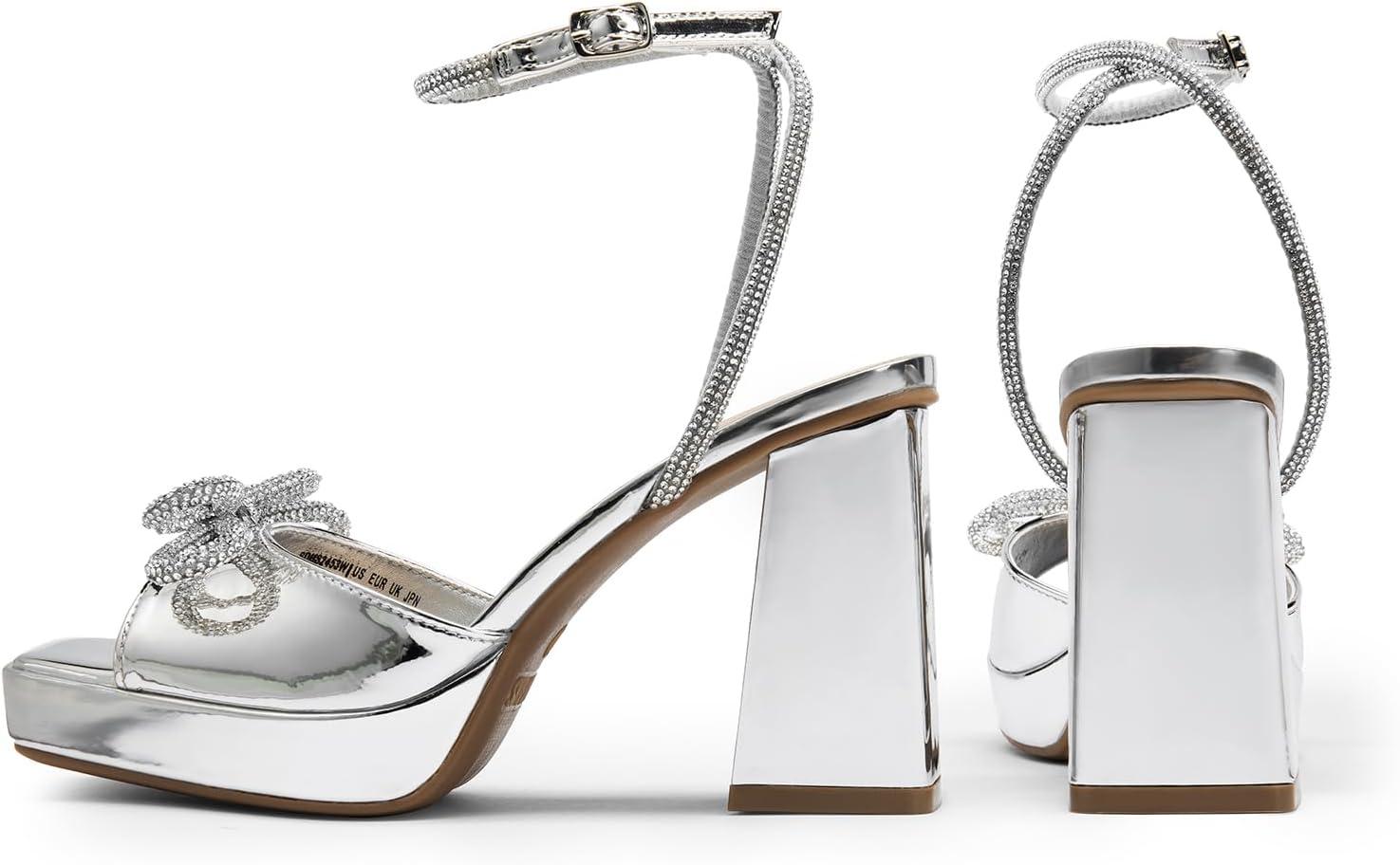 DREAM PAIRS Women’s Double Bowknots Platform Chunky Heels Rhinestone High Square Toe Dress Sandals for Wedding Bridal Party(Silver-pat)