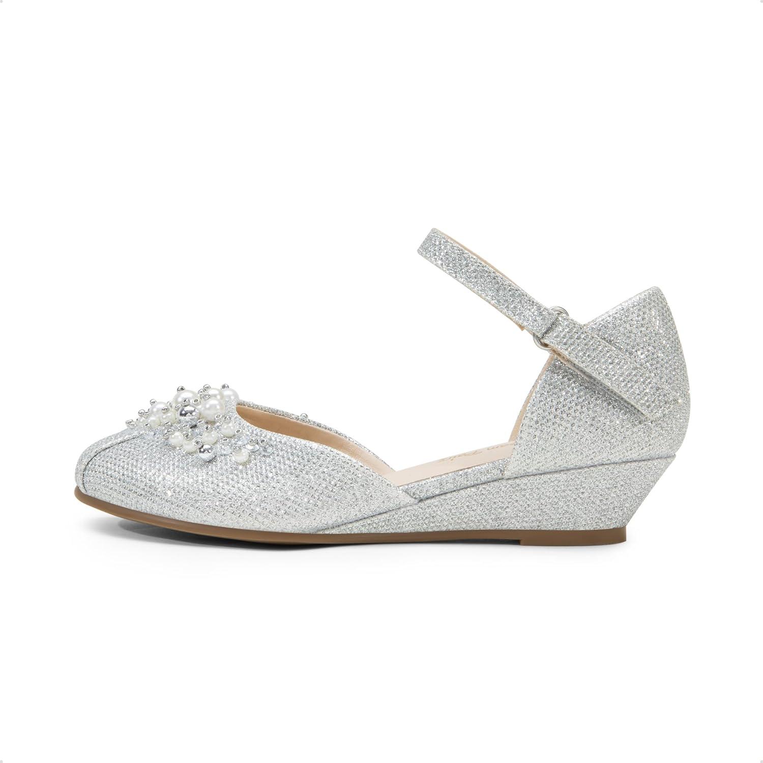 DREAM PAIRS Girls Dress Shoes Toddler Little Big Girls Heels Low Wedge Pumps with Pearls Rhinestone for Flower Girl Princess Wedding Party(Silver-glitter)