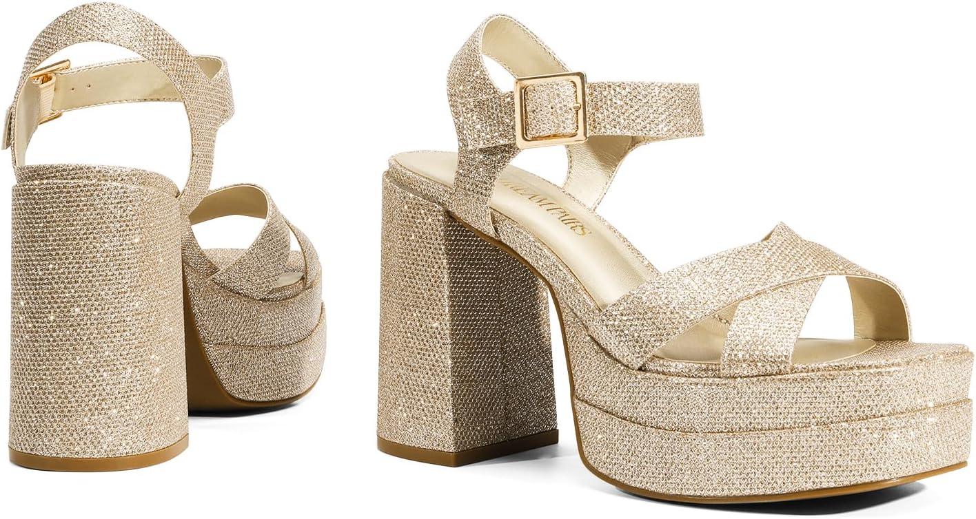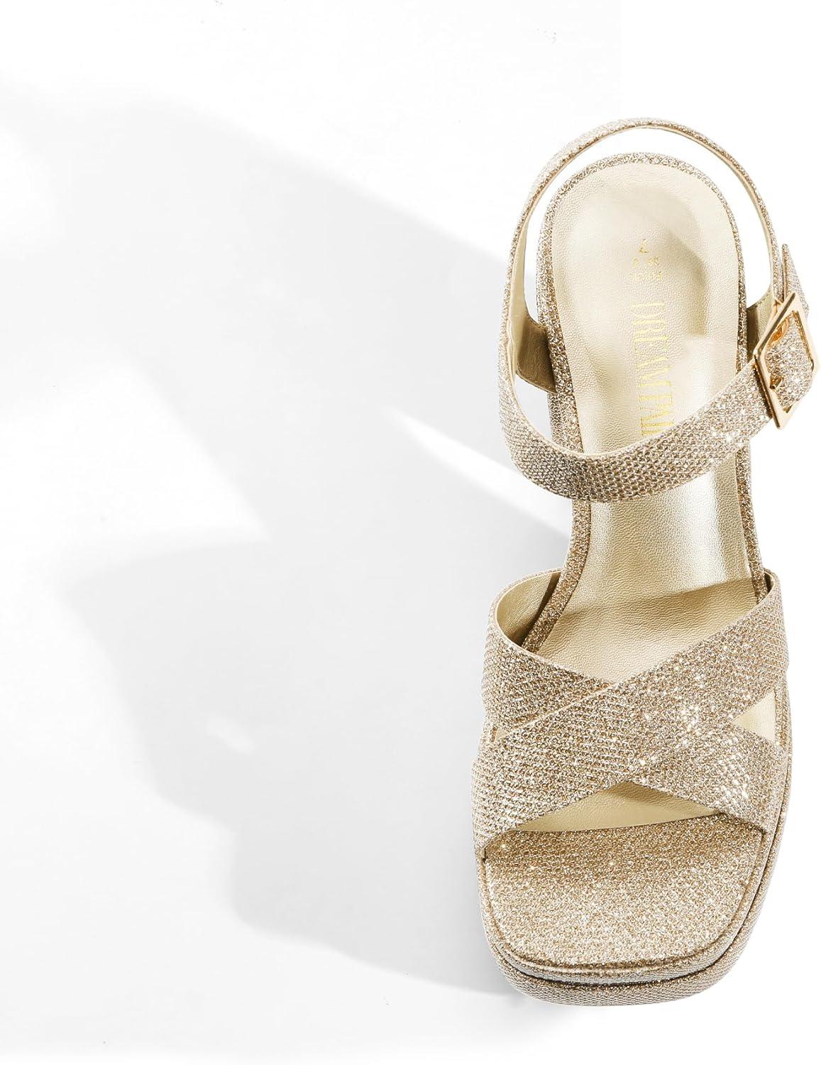 DREAM PAIRS Women’s Platform Chunky Heels Square Open Toe Ankle Strap High Heeled Sandals Y2K Shoes for Party Brunch(Gold-glitter)