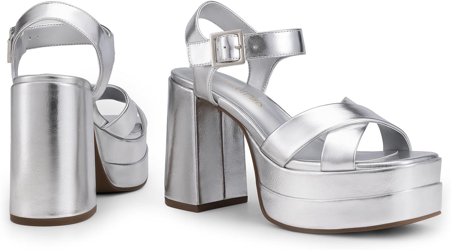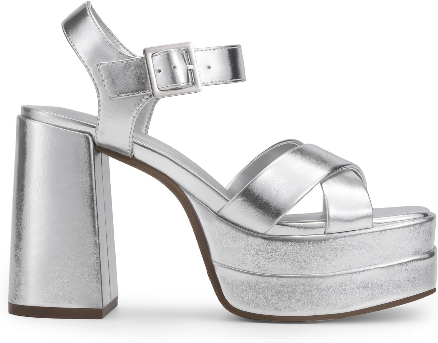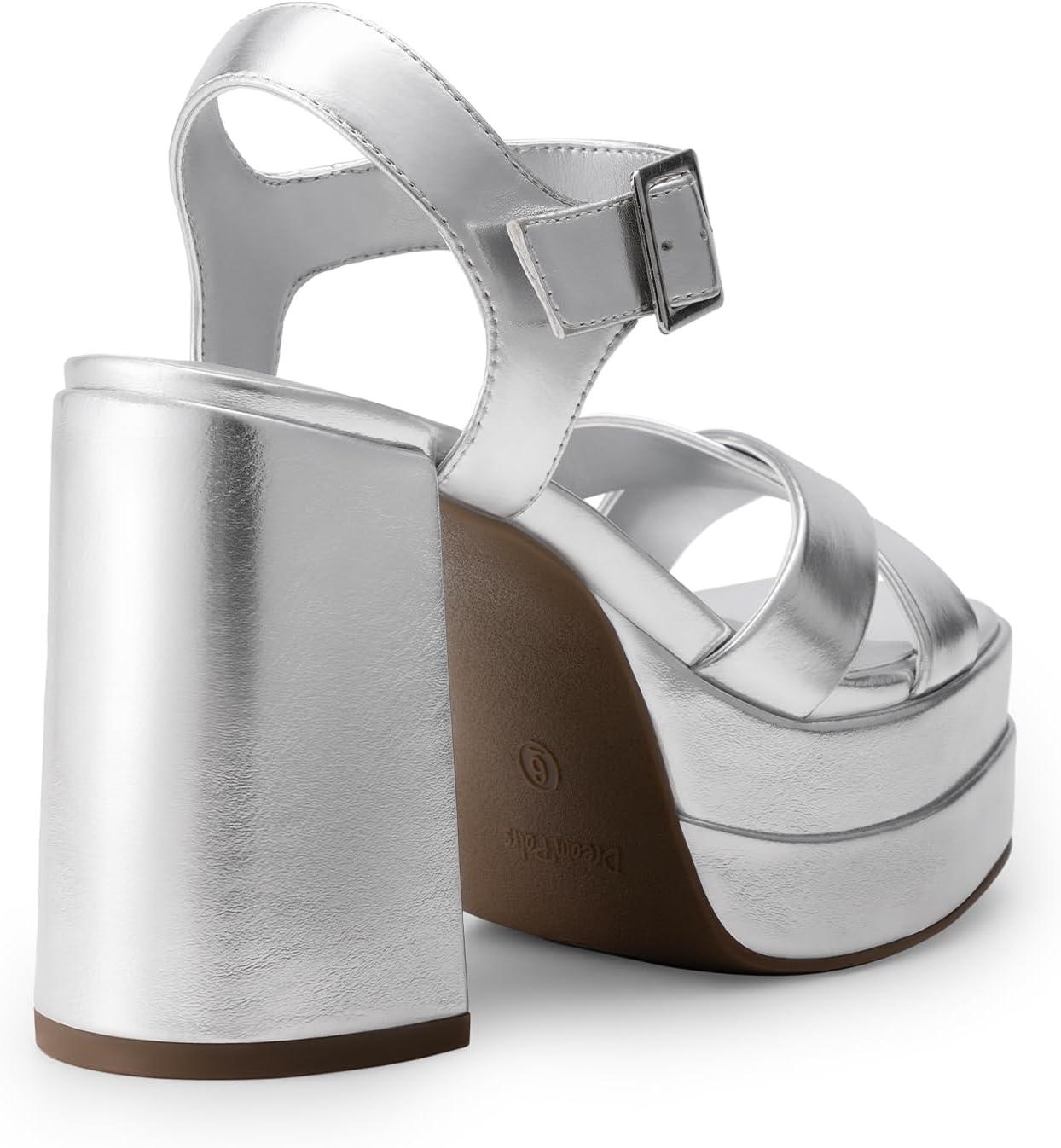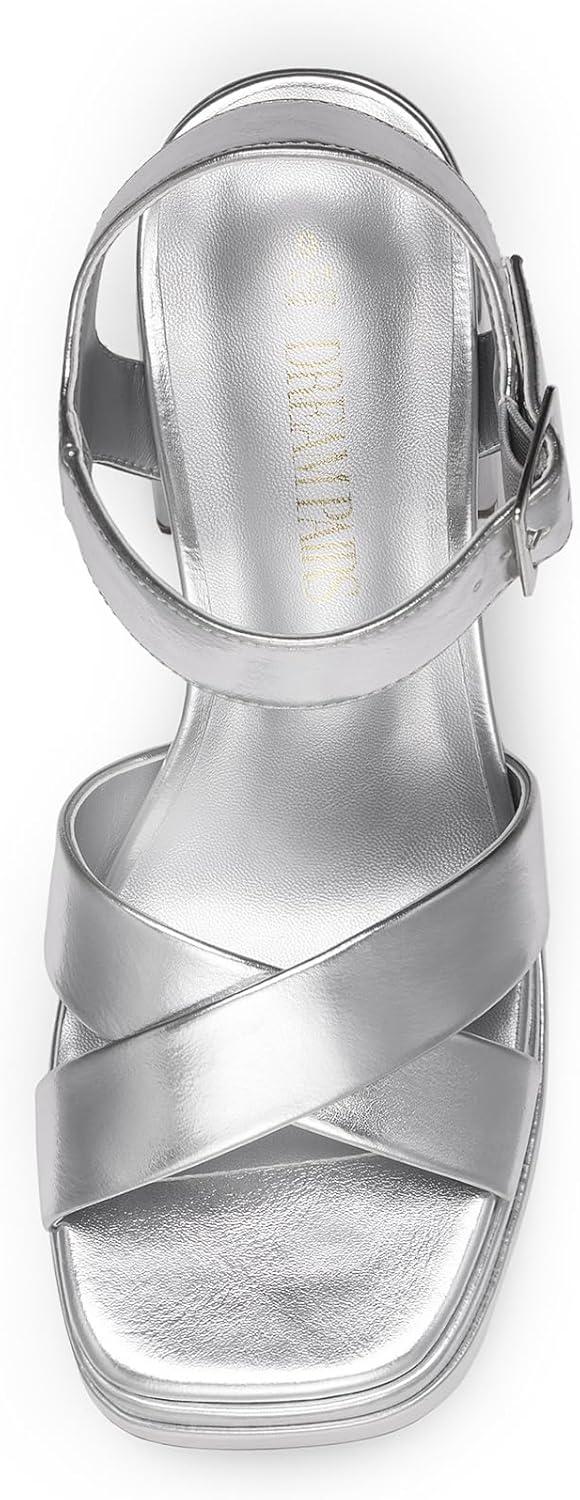 DREAM PAIRS Women’s Platform Chunky Heels Square Open Toe Ankle Strap High Heeled Sandals Y2K Shoes for Party Brunch(Silver-metallic)