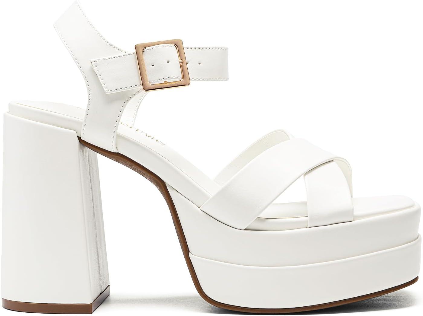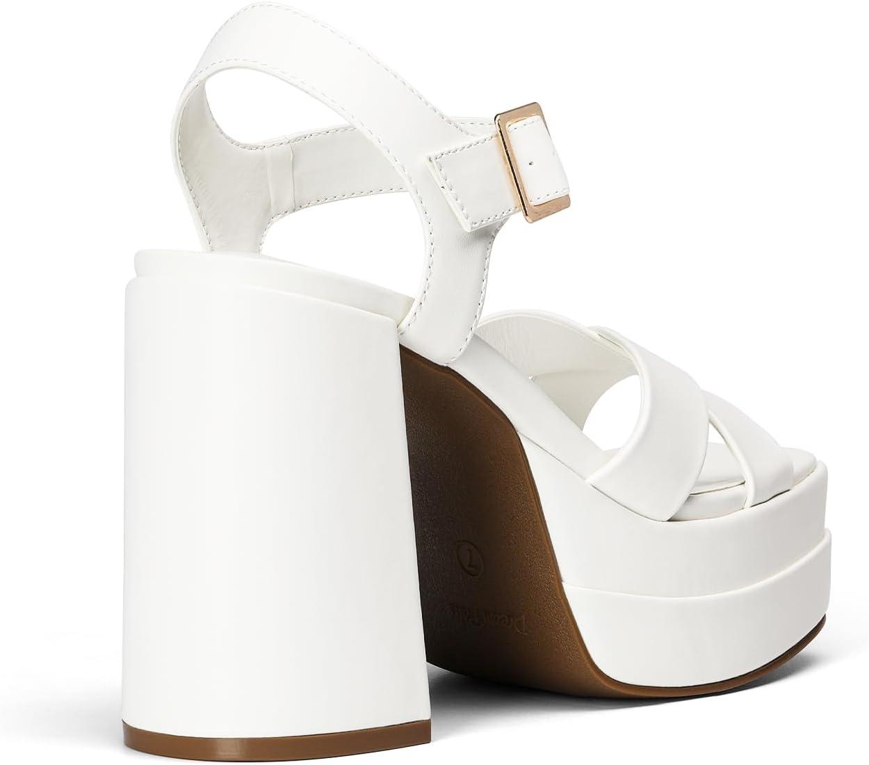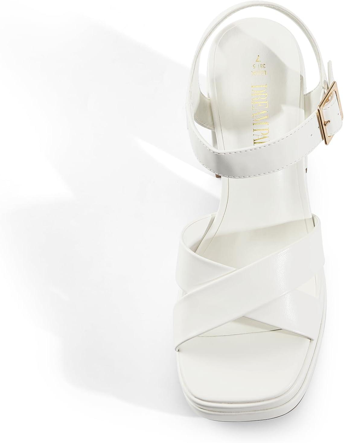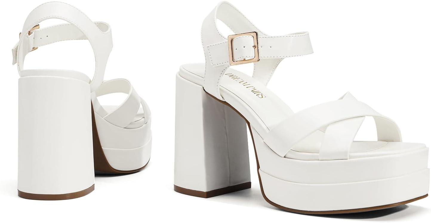 DREAM PAIRS Women’s Platform Chunky Heels Square Open Toe Ankle Strap High Heeled Sandals Y2K Shoes for Party Brunch(White)