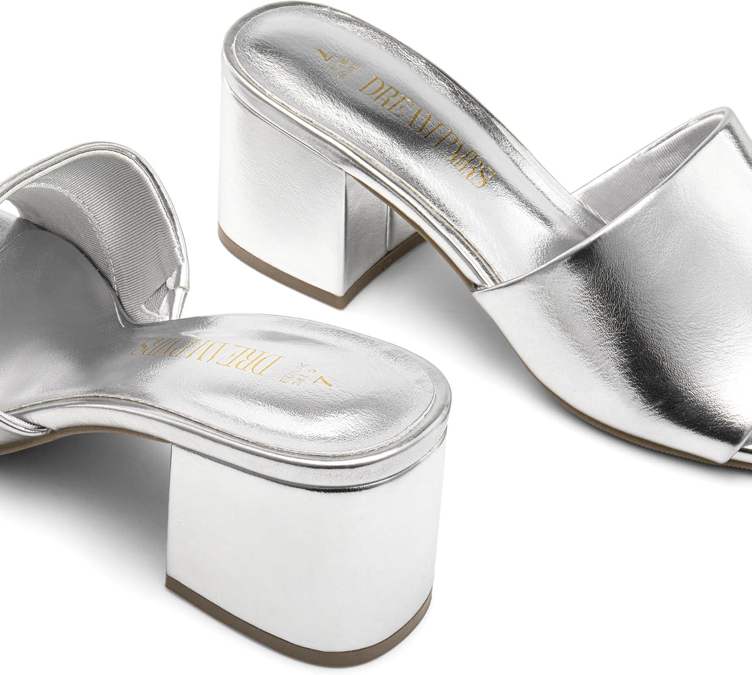 DREAM PAIRS Women’s Square Open Toe Heels Sandals Low Block Chunky Heeled Sandals Slide Sandals Slip on Comfortable Casual Pumps Shoes(Silver-pu)