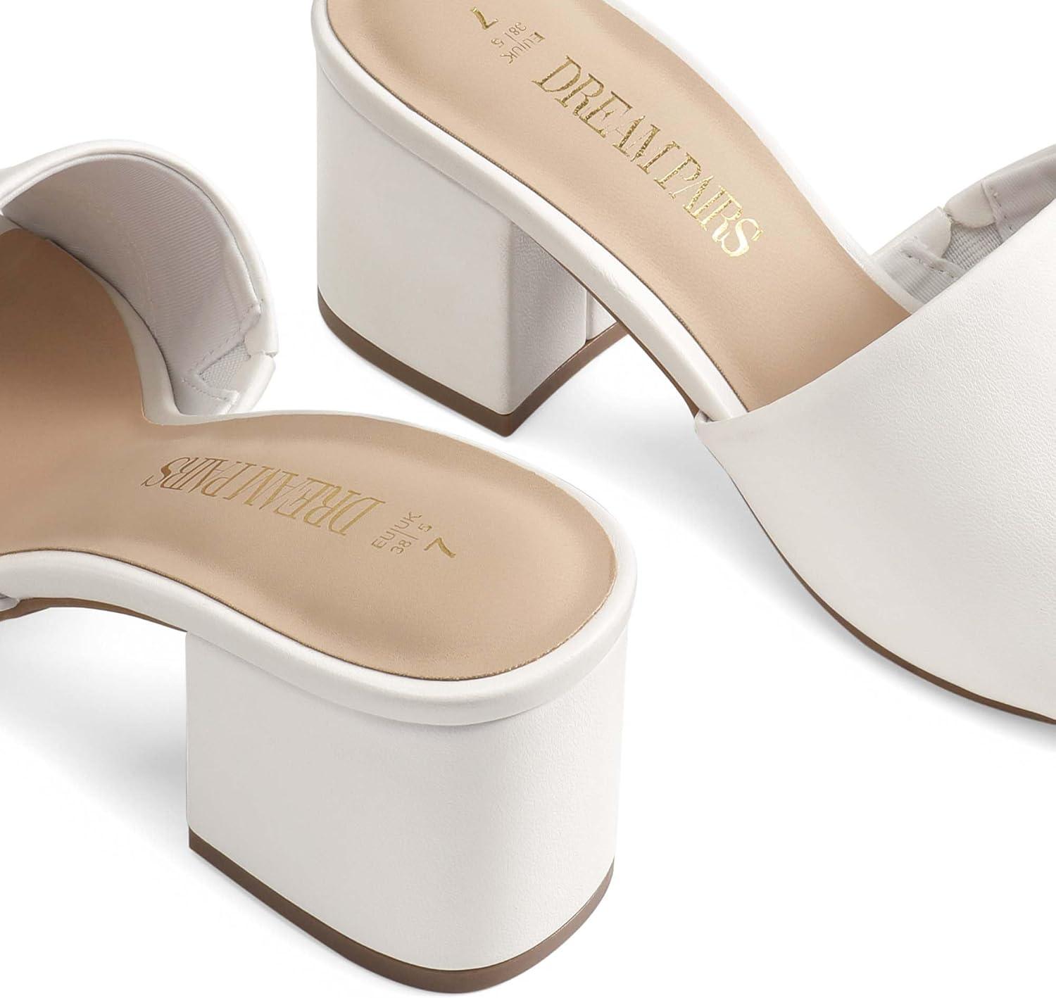 DREAM PAIRS Women’s Square Open Toe Heels Sandals Low Block Chunky Heeled Sandals Slide Sandals Slip on Comfortable Casual Pumps Shoes(White-pu)