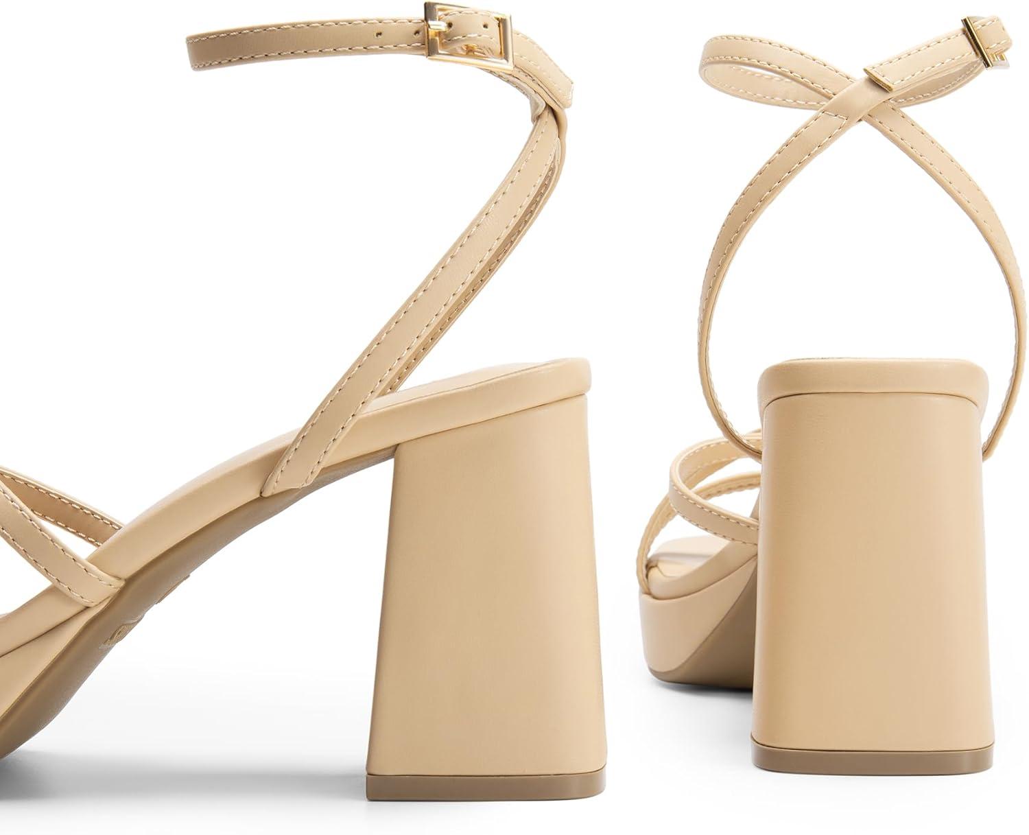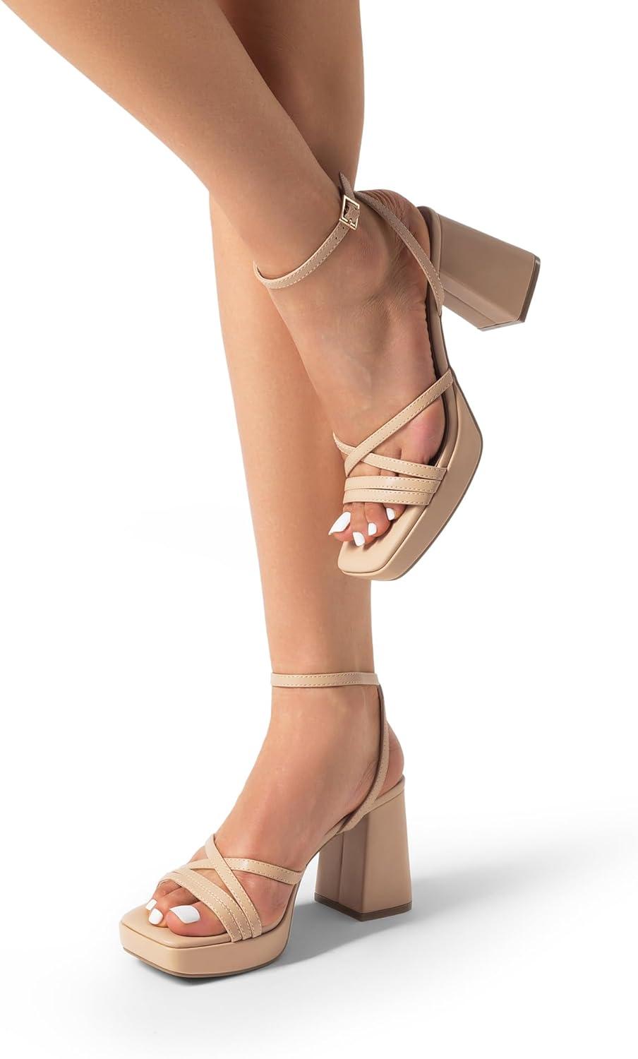 DREAM PAIRS Strappy Heels for Women Platform Chunky High 3-inch Heeled Sandals with Square Open Toe Ankle Buckle for Graduation Party Prom Daily Wedding(Nude-pu)