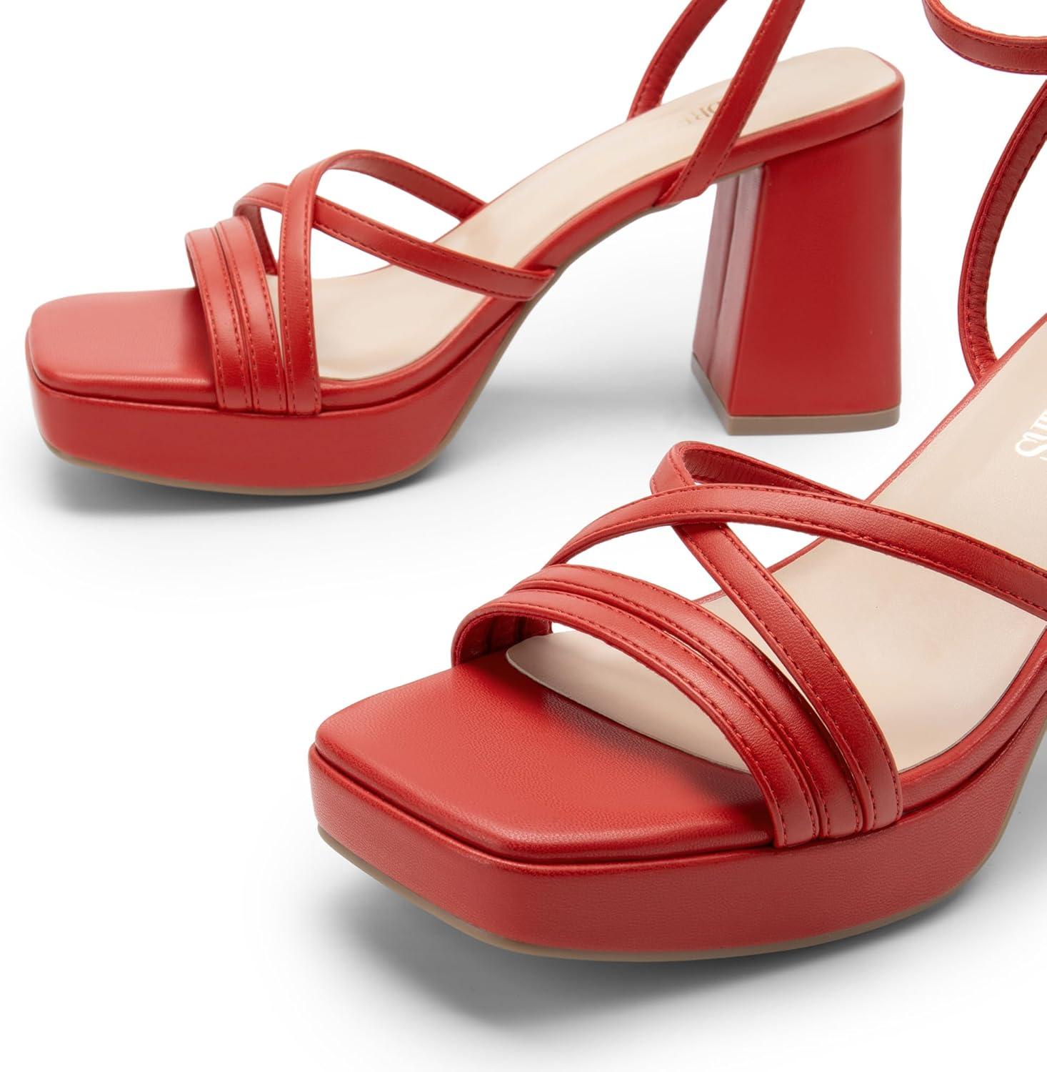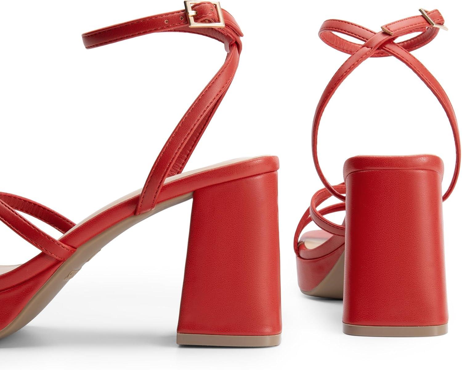 DREAM PAIRS Strappy Heels for Women Platform Chunky High 3-inch Heeled Sandals with Square Open Toe Ankle Buckle for Graduation Party Prom Daily Wedding(Red-pu)