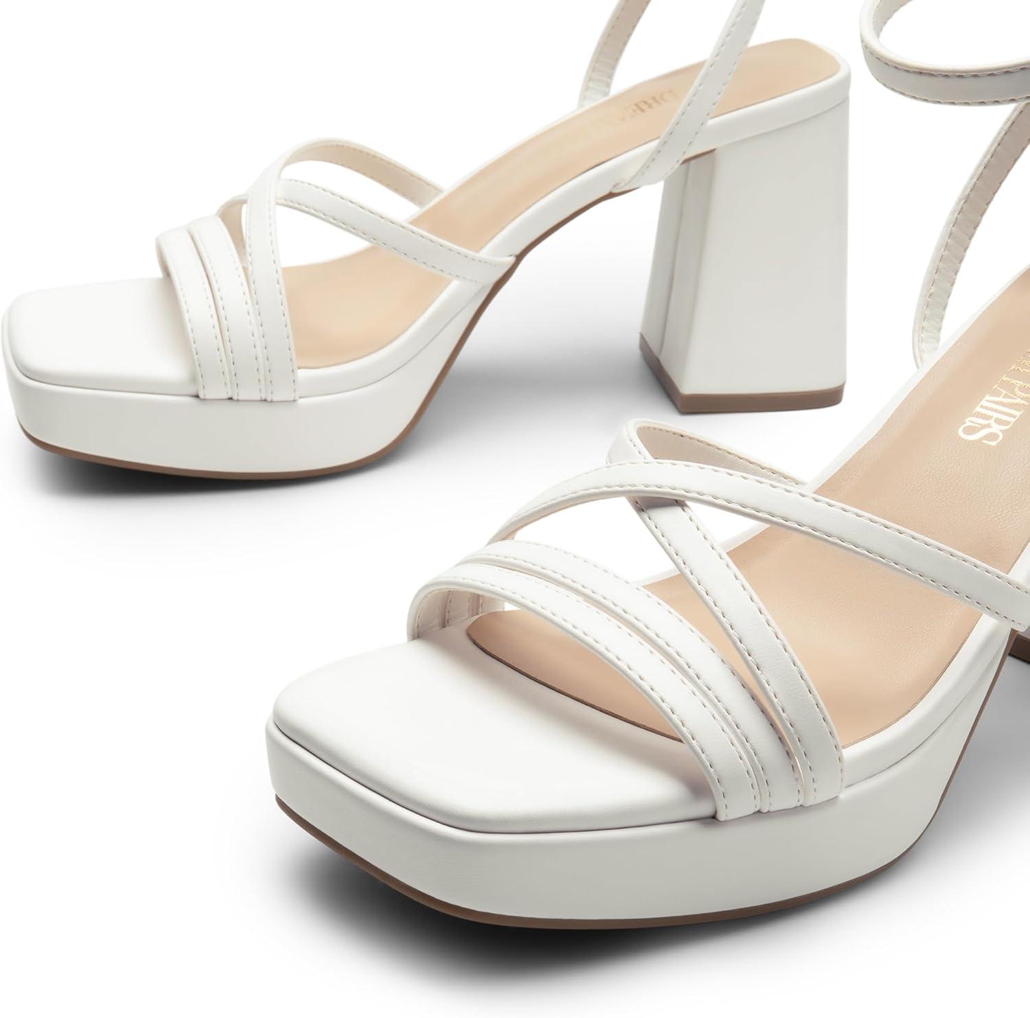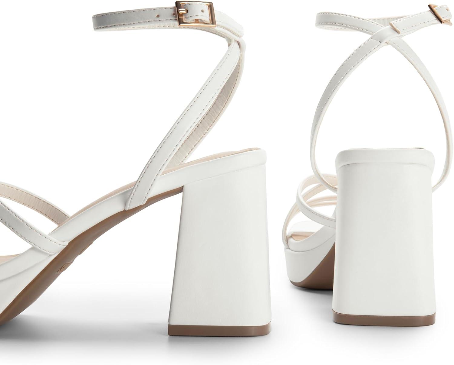 DREAM PAIRS Strappy Heels for Women Platform Chunky High 3-inch Heeled Sandals with Square Open Toe Ankle Buckle for Graduation Party Prom Daily Wedding(White-pu)