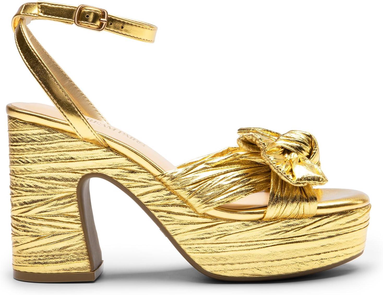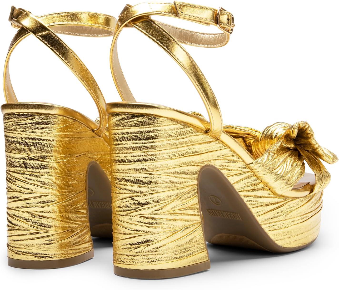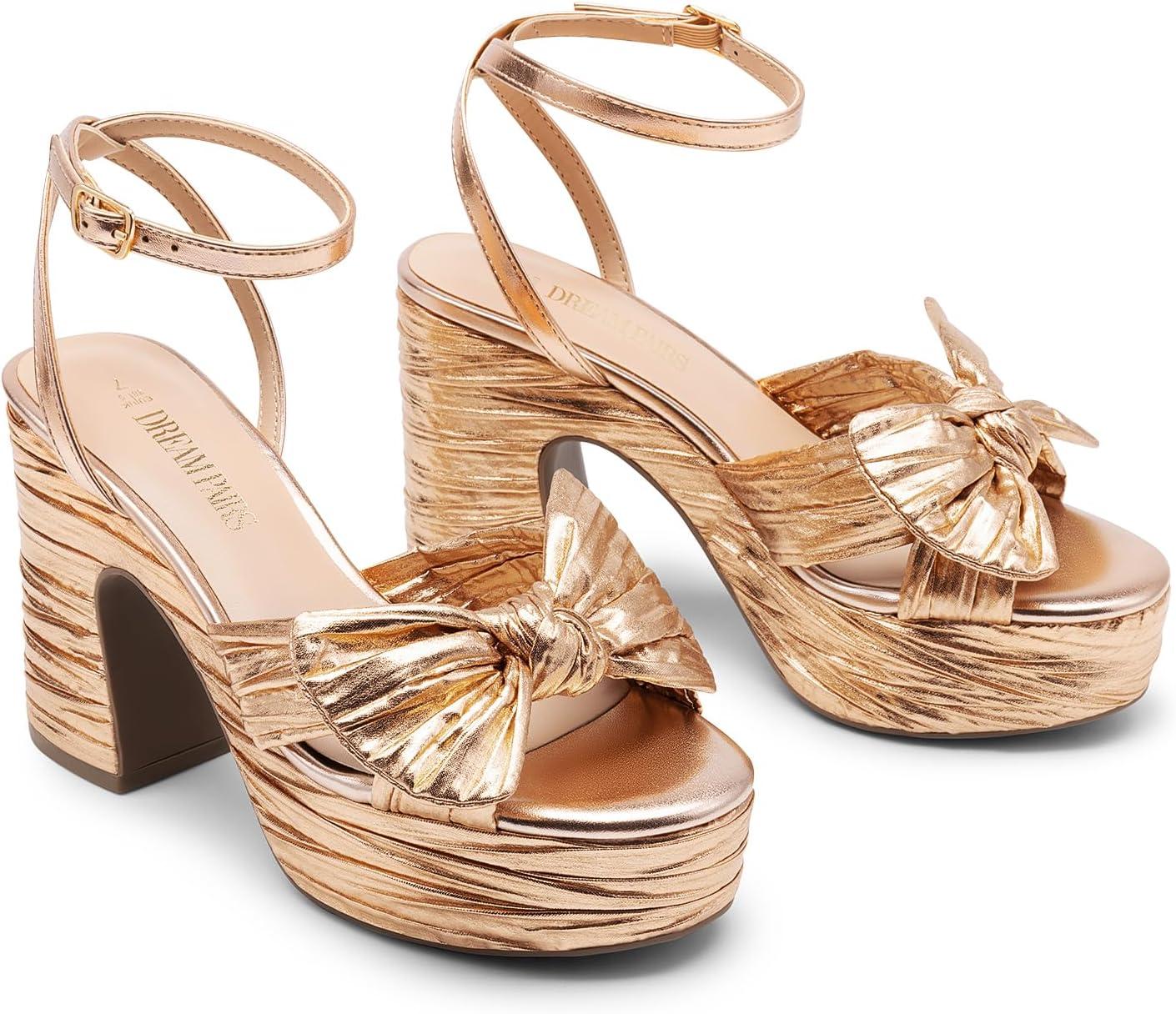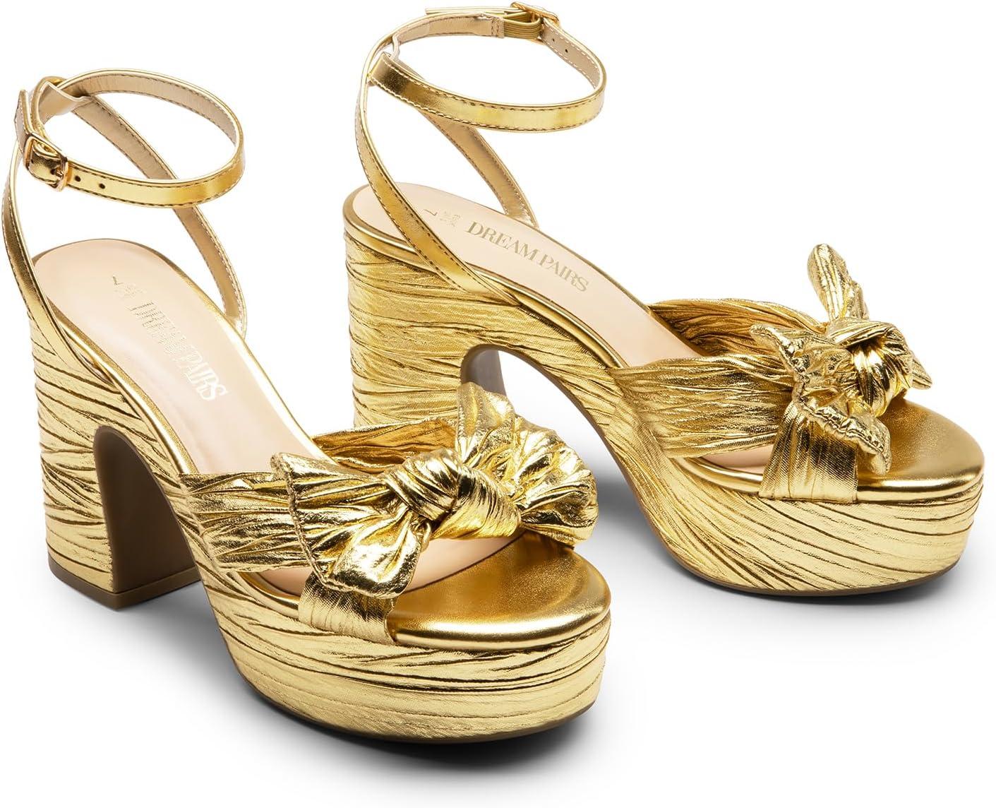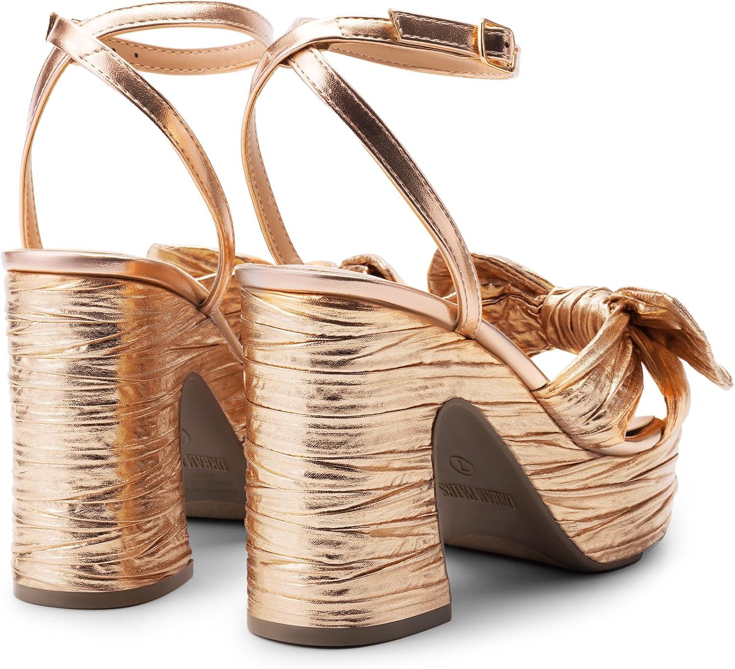 DREAM PAIRS Women’s Chunky Platform Heels Sandals Pleated Bow Knot Ankle Buckle Strap Heeled Sandals Open Toe Comfortable Wedding Party Dress Shoes(Gold)