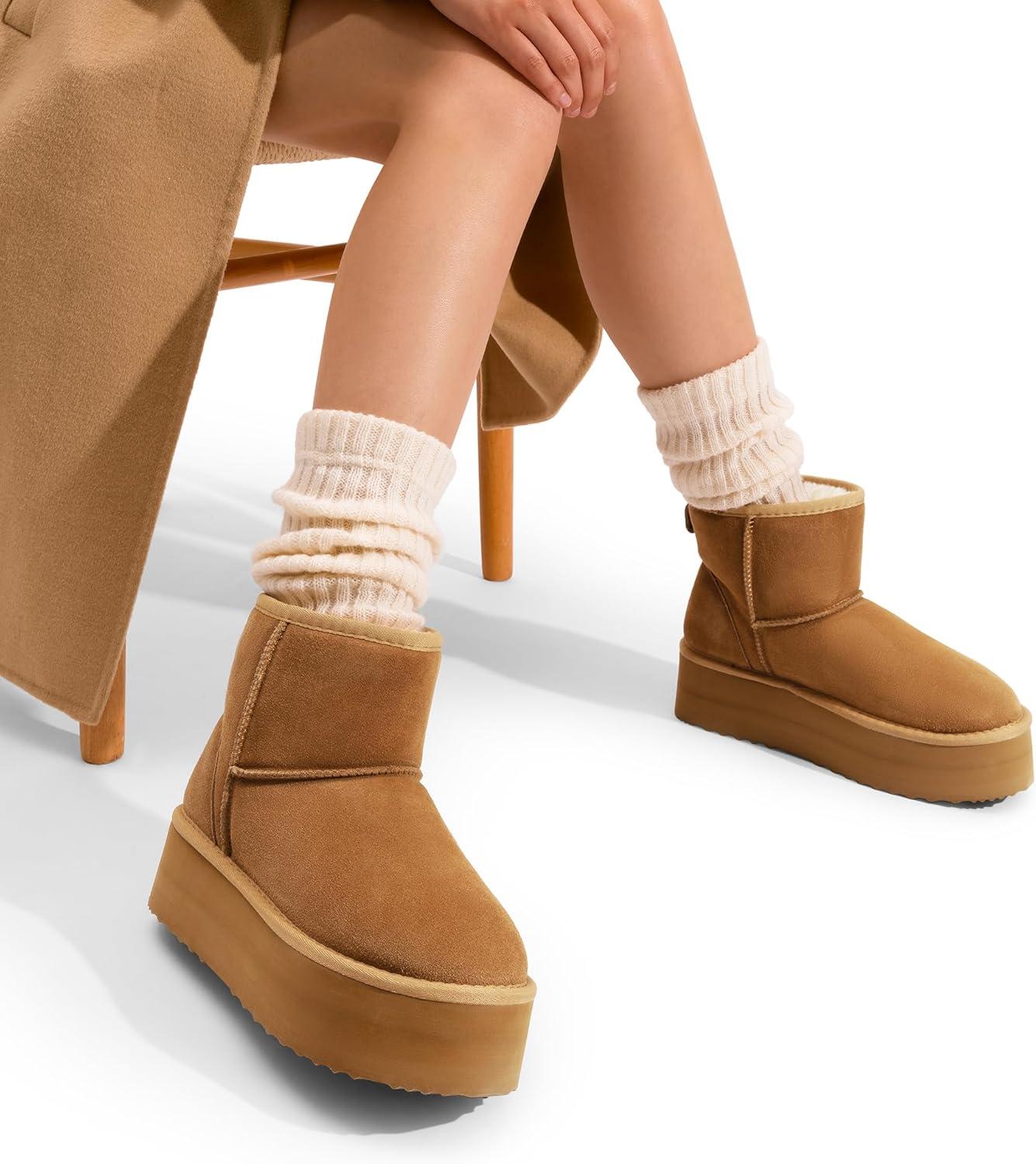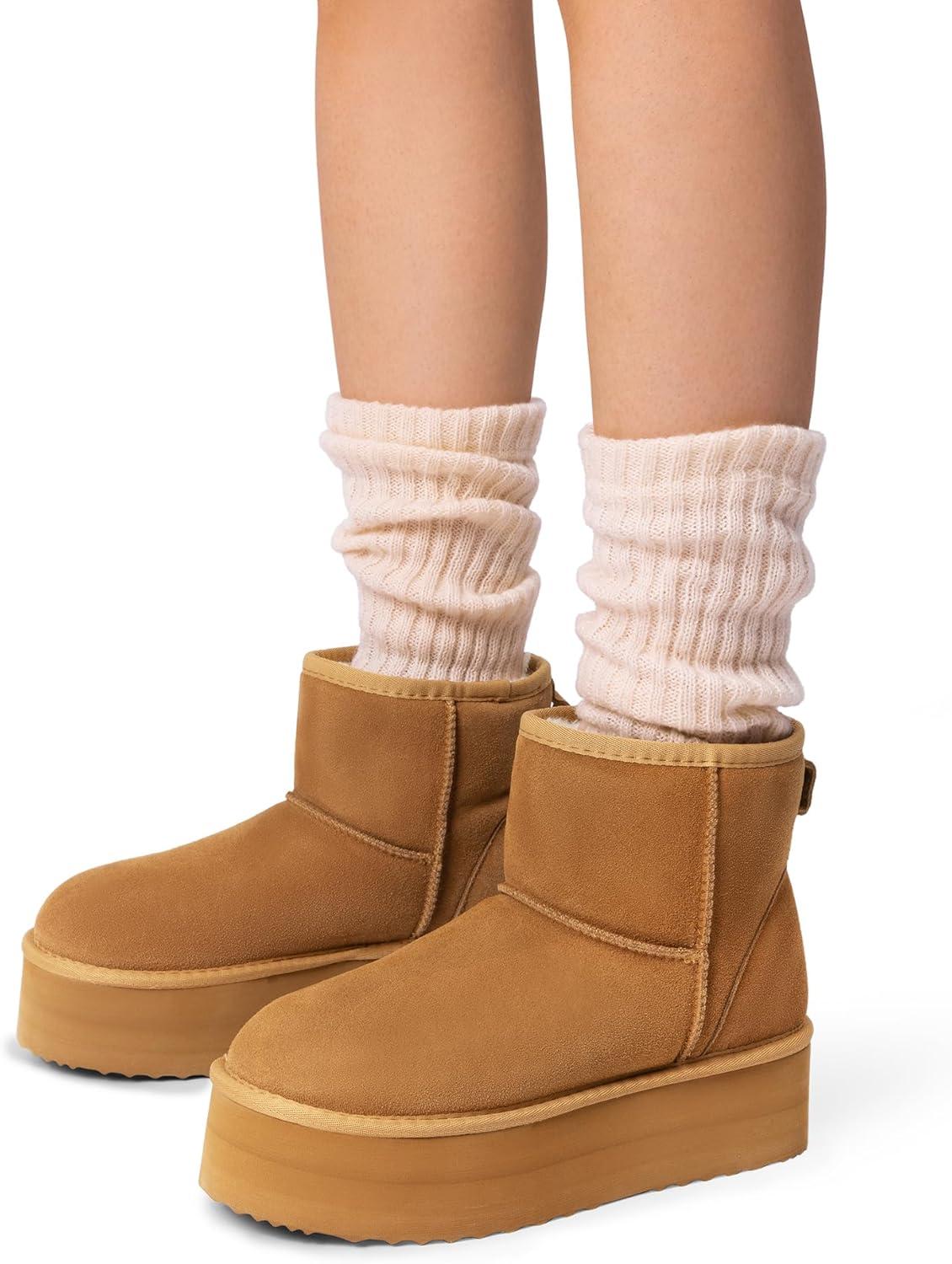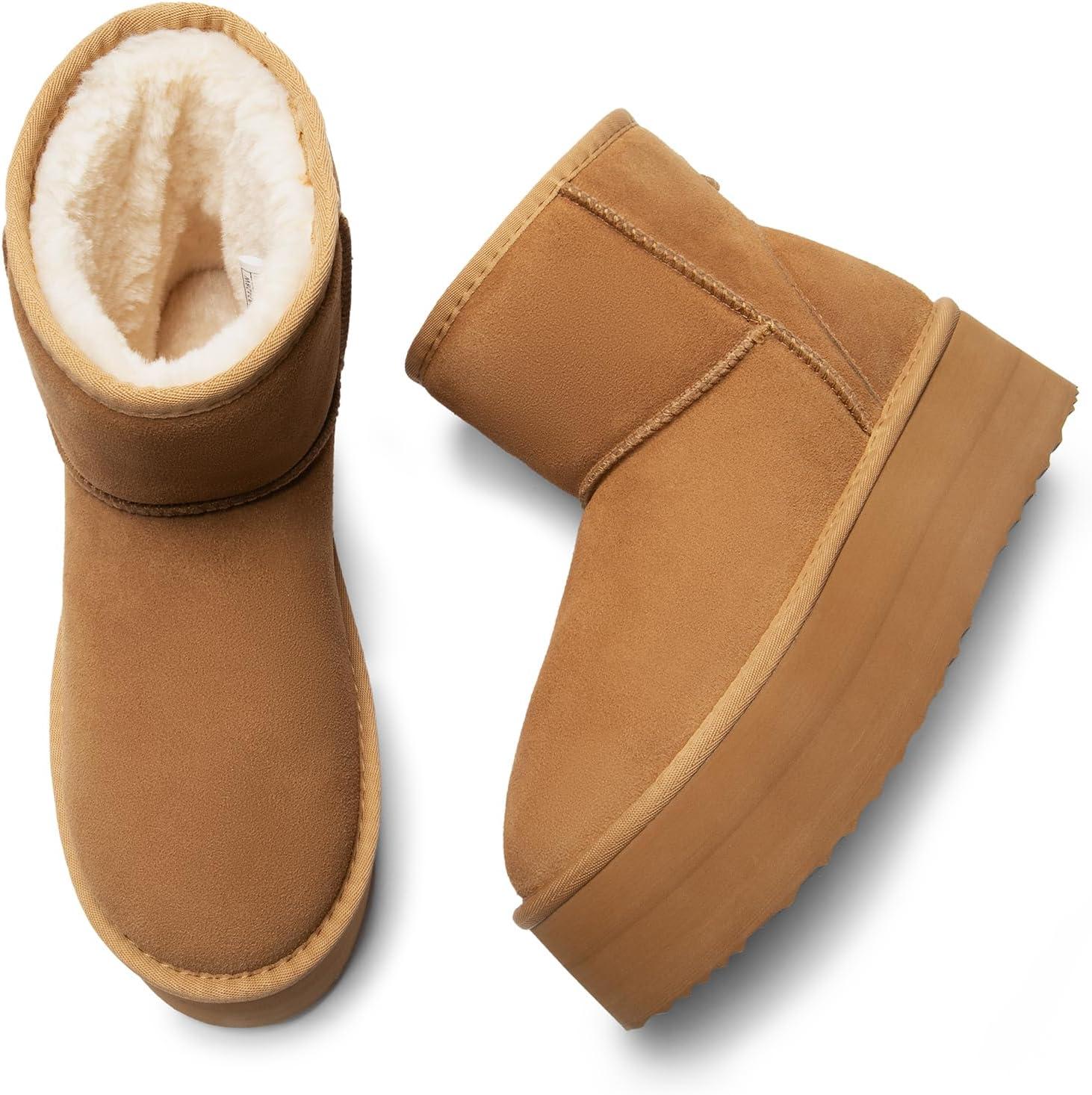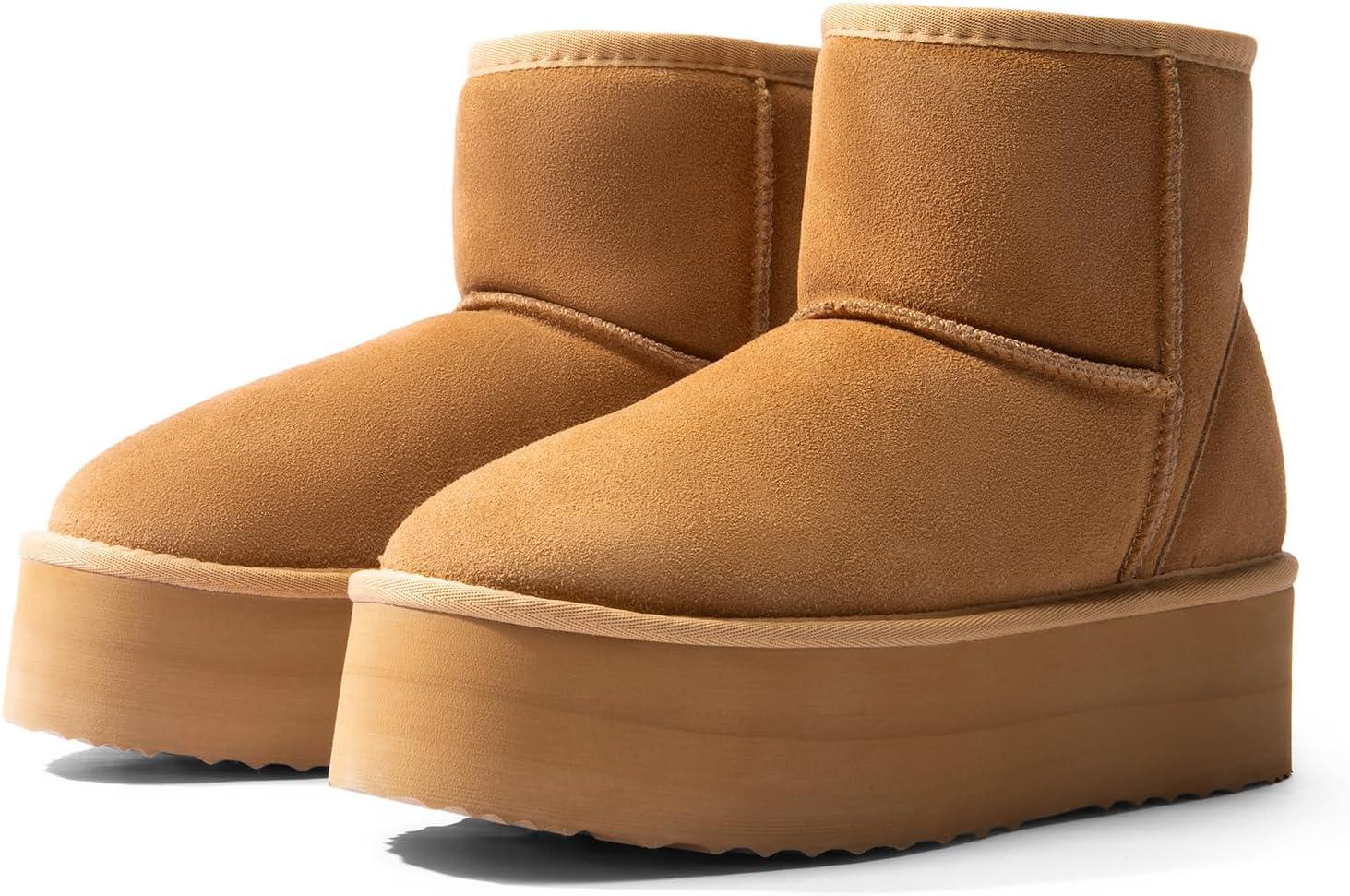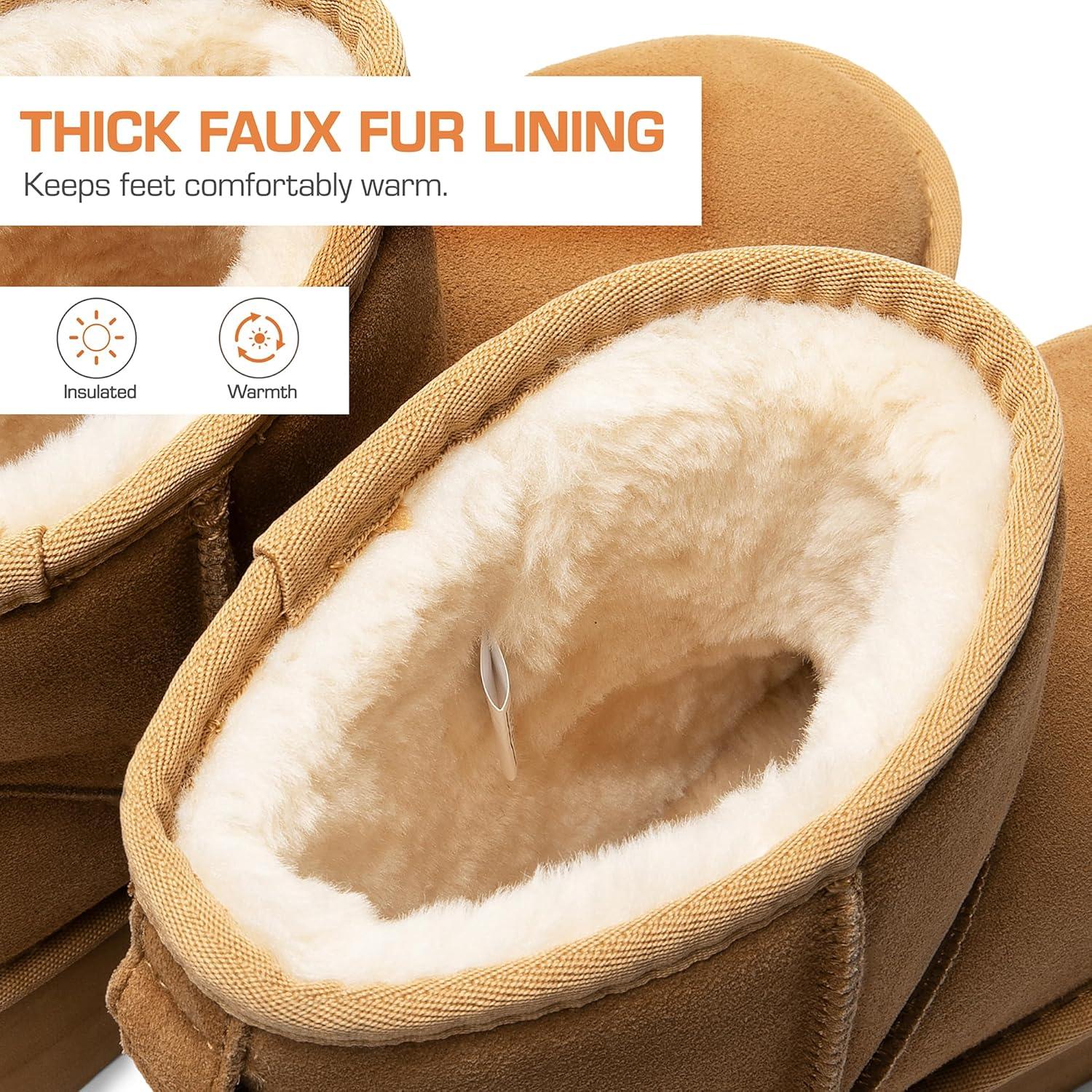 DREAM PAIRS Genuine Suede Classic Platform Boots for Women Water Resistant FuzzyClassic Ankle Winter Snow Low Boots with DIY Bows Faux Fur Lining Memory Foam Anti-Slip(Chestnut)