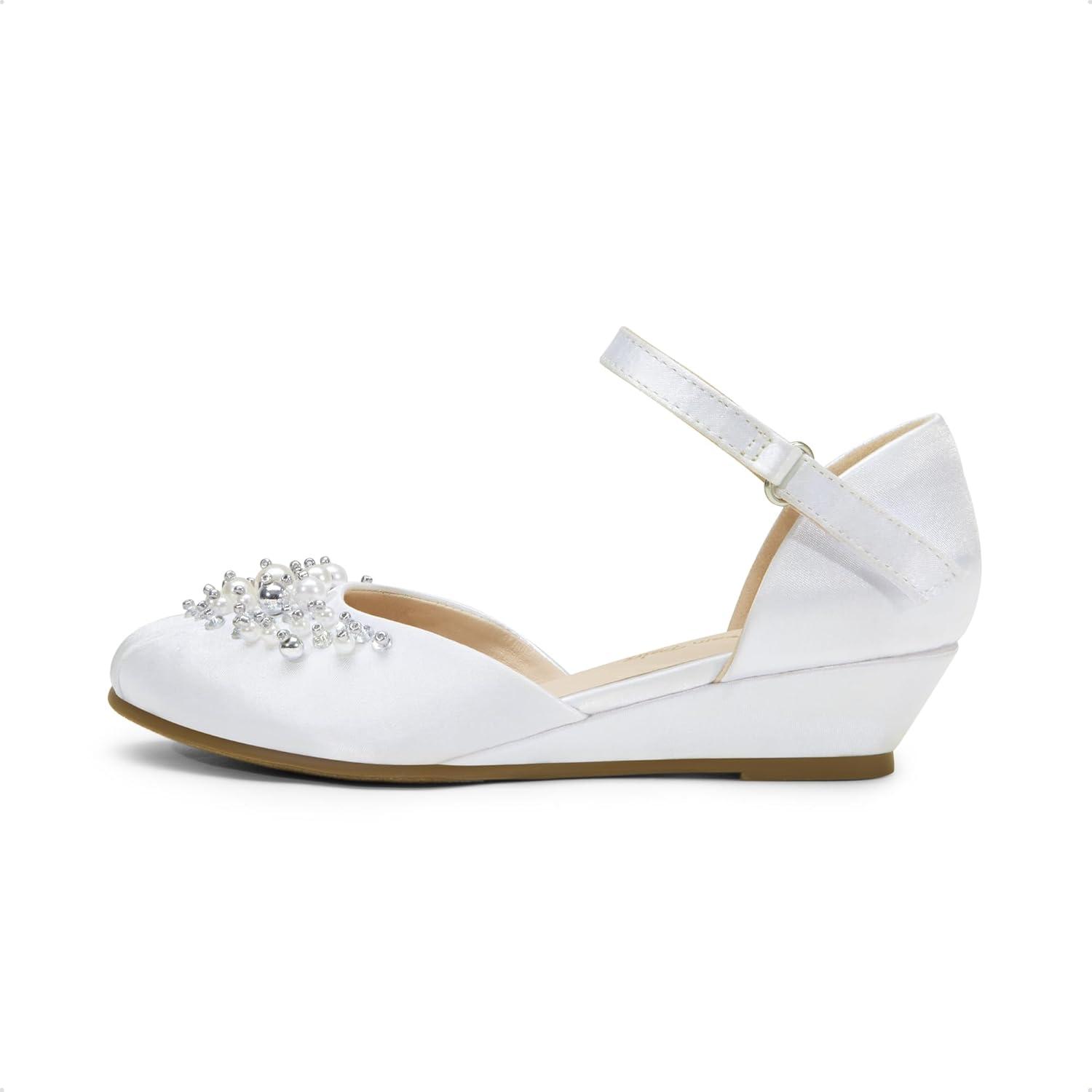 DREAM PAIRS Girls Dress Shoes Toddler Little Big Girls Heels Low Wedge Pumps with Pearls Rhinestone for Flower Girl Princess Wedding Party(White)