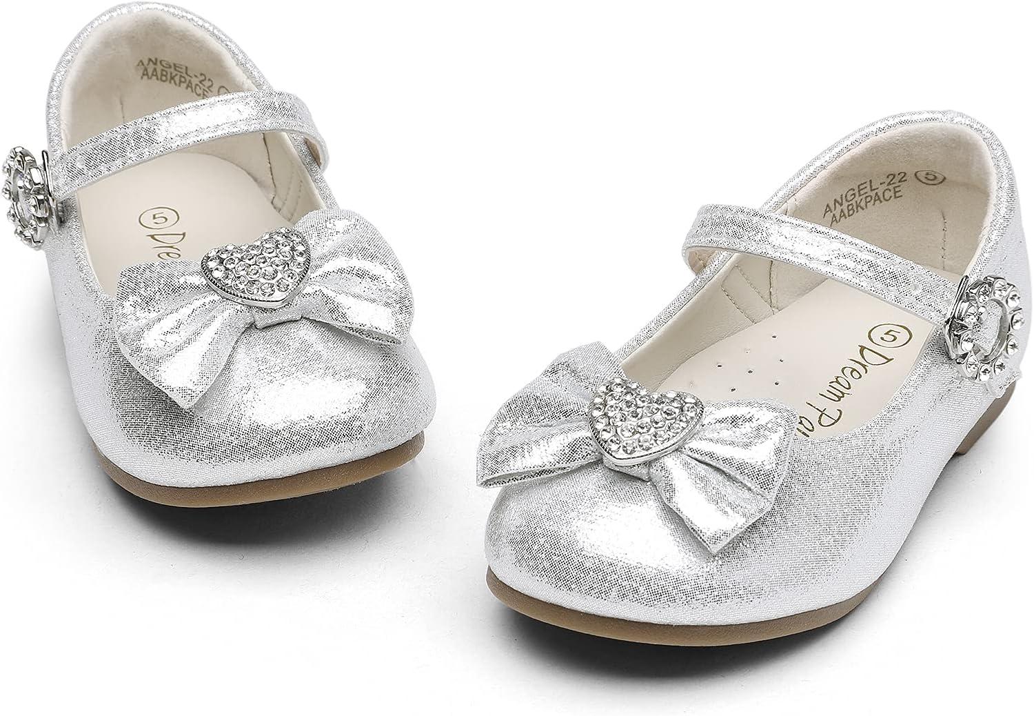 DREAM PAIRS Girls Mary Jane Dress Shoes for Toddler Heart Rhinestone Front Bow Ballerina Flat (Toddler/Little Kid)(Silver)