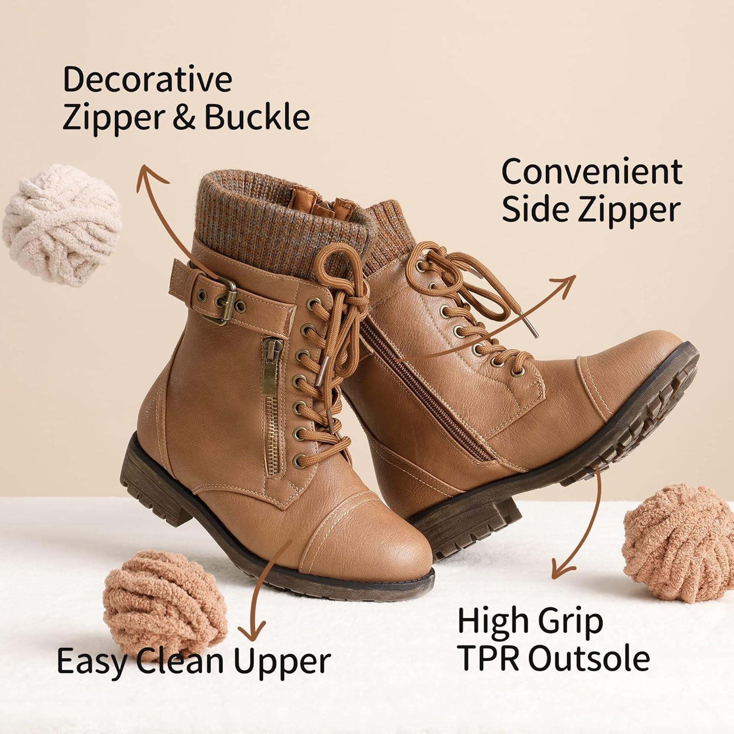 DREAM PAIRS Girl’s Mid Calf Combat Ankle Lace up Boots(Camel)