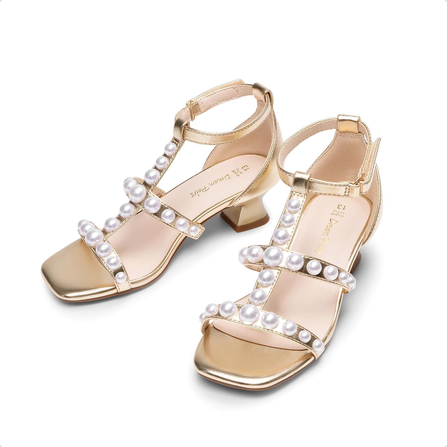 DREAM PAIRS Girls Sandals Ankle Strap T-Strap Low Heel Pearl Flower Pump Dress Wedding Party Square Toe Shoes for Little Kid/Big Kid(Gold)